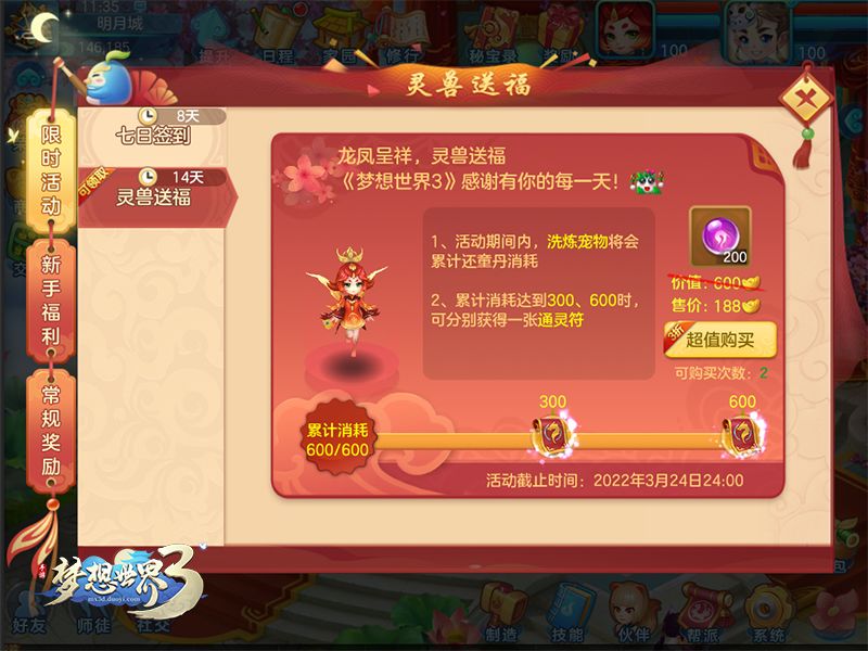 丨洗宠福利:3月10日维护后~3月24日24:00,活动期间,洗炼宠物累计消耗一定数量的还童丹可获得通灵符奖励!