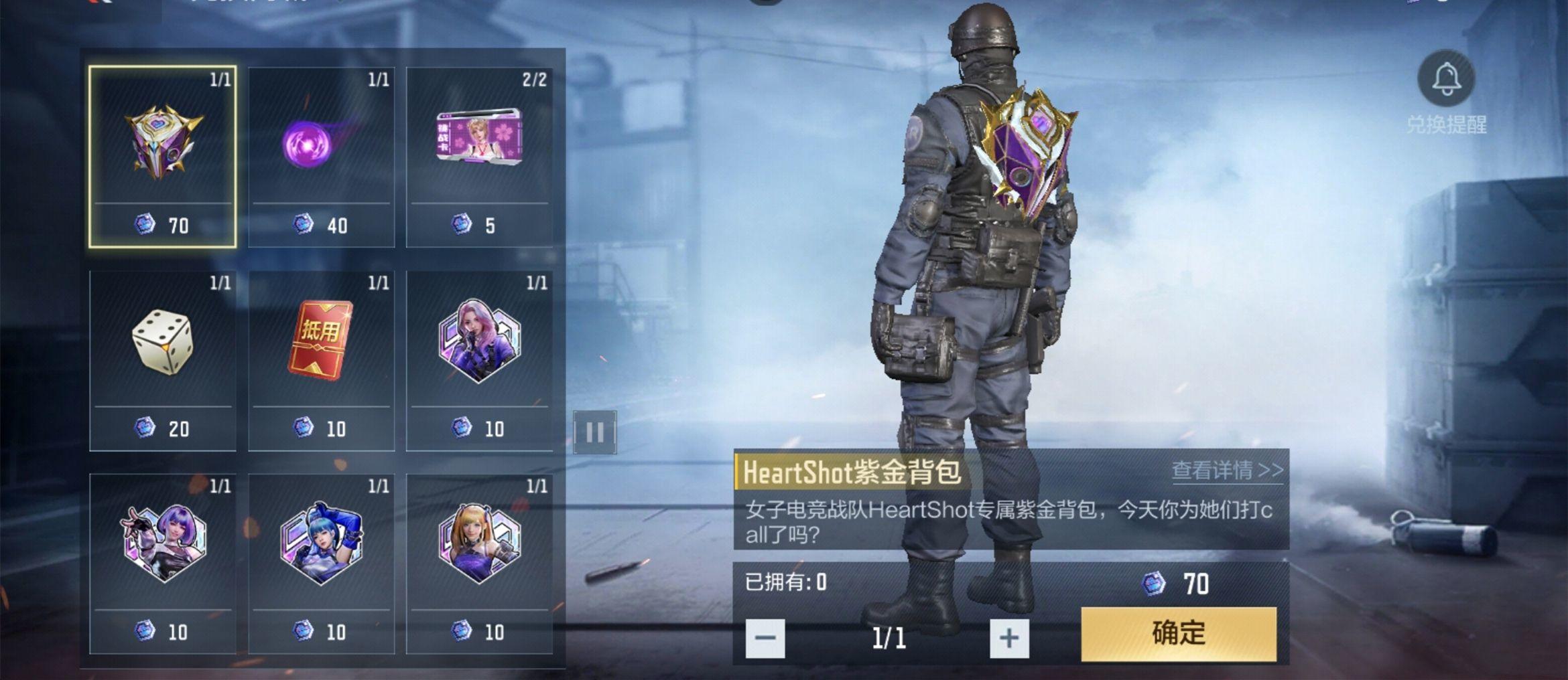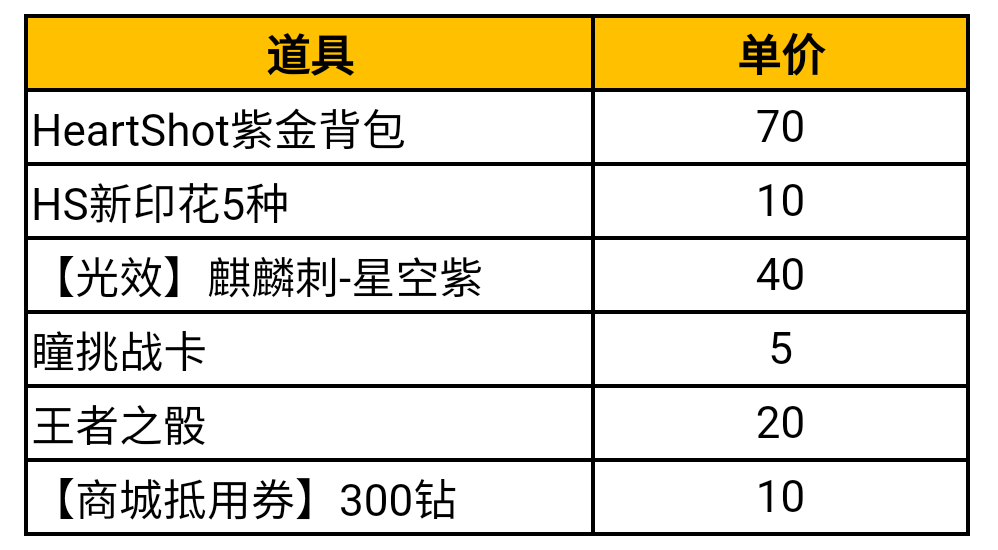 那么问题来了,HeartShot兑换币可以换些什么道具呢?可兑换的奖励有HeartShot紫金背包、5种HeartShot角色的印花、王者之骰等等,具体的价格请参考下表。HS印花和背包,都是18号之后才可以兑换,另外需要注意的是,除了瞳挑战卡能兑换2次以外,奖池中的所有道具都只能兑换一次。