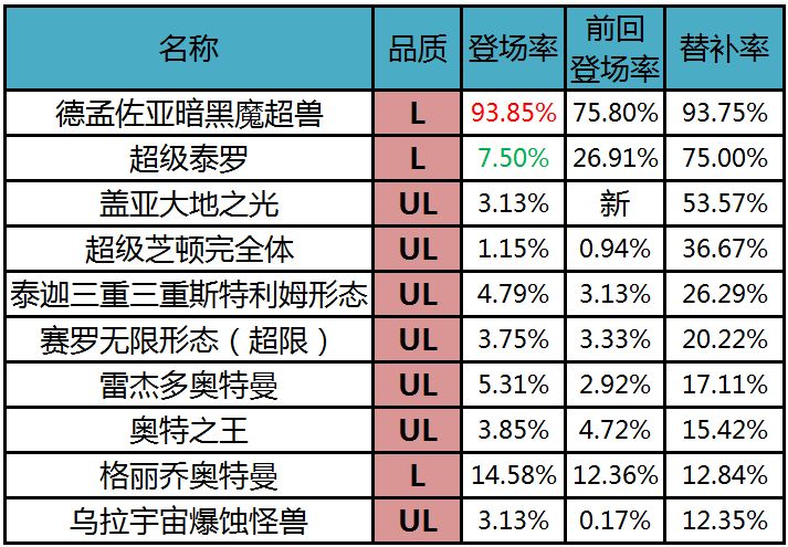 经过以上数据,我们可以发现,新卡光辉赛罗和老牌辅助格罗布在本次前三登场中表现亮眼,而托雷基亚和格里姆德组合的表现依然坚挺,迪莫杰厄作为后援辅助,已成为大部分玩家的最优选择。当然,我们后续会继续优化游戏环境,给小伙伴们更好的体验!
