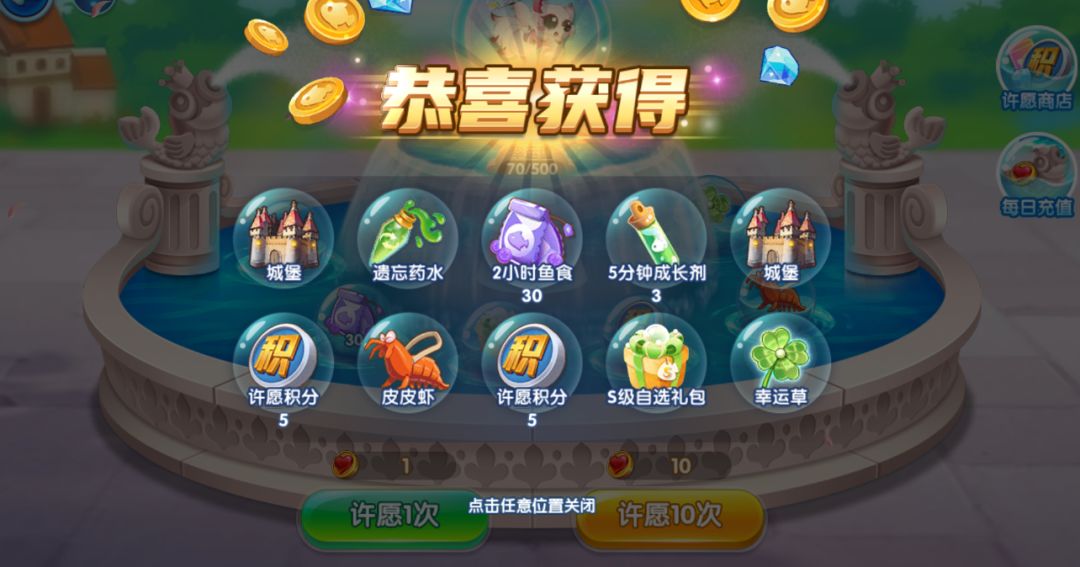 许愿池玩法是馆长们平时累充额外可以获得的福利还有超多活动限定鱼等你带回家~
