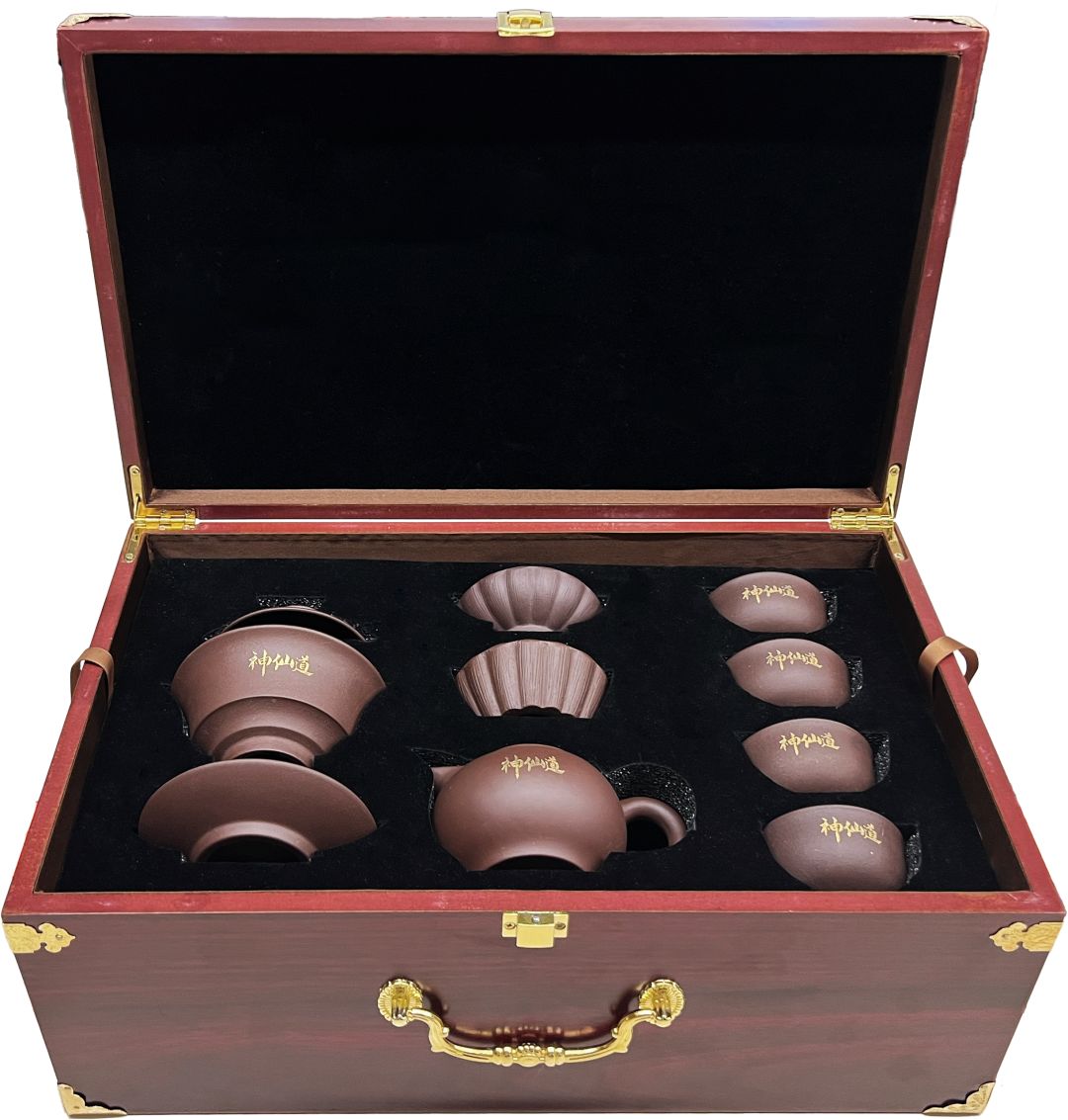 茶具刻有《神仙道》专属游戏logo,材质紫砂,产自江苏宜兴,配有电胶木茶托,器型美,优雅曲线,温婉清秀,打磨光滑手感佳。