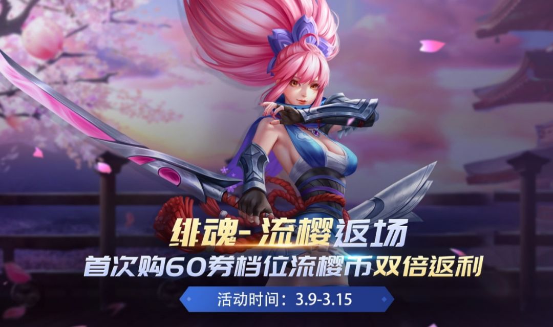3月9日-3月15日,首次购买60券档位流樱币享双倍返利,共可获得120个流樱币,仅限购买1次!