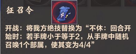 征召令是火属性主将专用法器。火属性拥有强大的伤害力,但代价往往是自伤或是弃牌。想要更多地触发法器效果就得更快得打出卡牌或弃牌,获取卡牌时也就更倾向于选择费用小的卡牌,对于卡组的构筑是个考验呢~若运用得当,就能使场面优势加速扩大哦~!