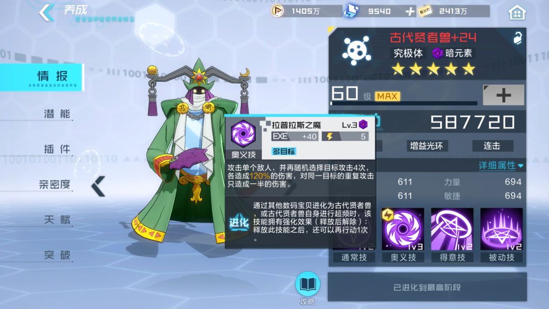 核心技能3:奥义技-拉普拉斯之魔,5破一回合触发所有BUFF,BUFFf持续提供5回合