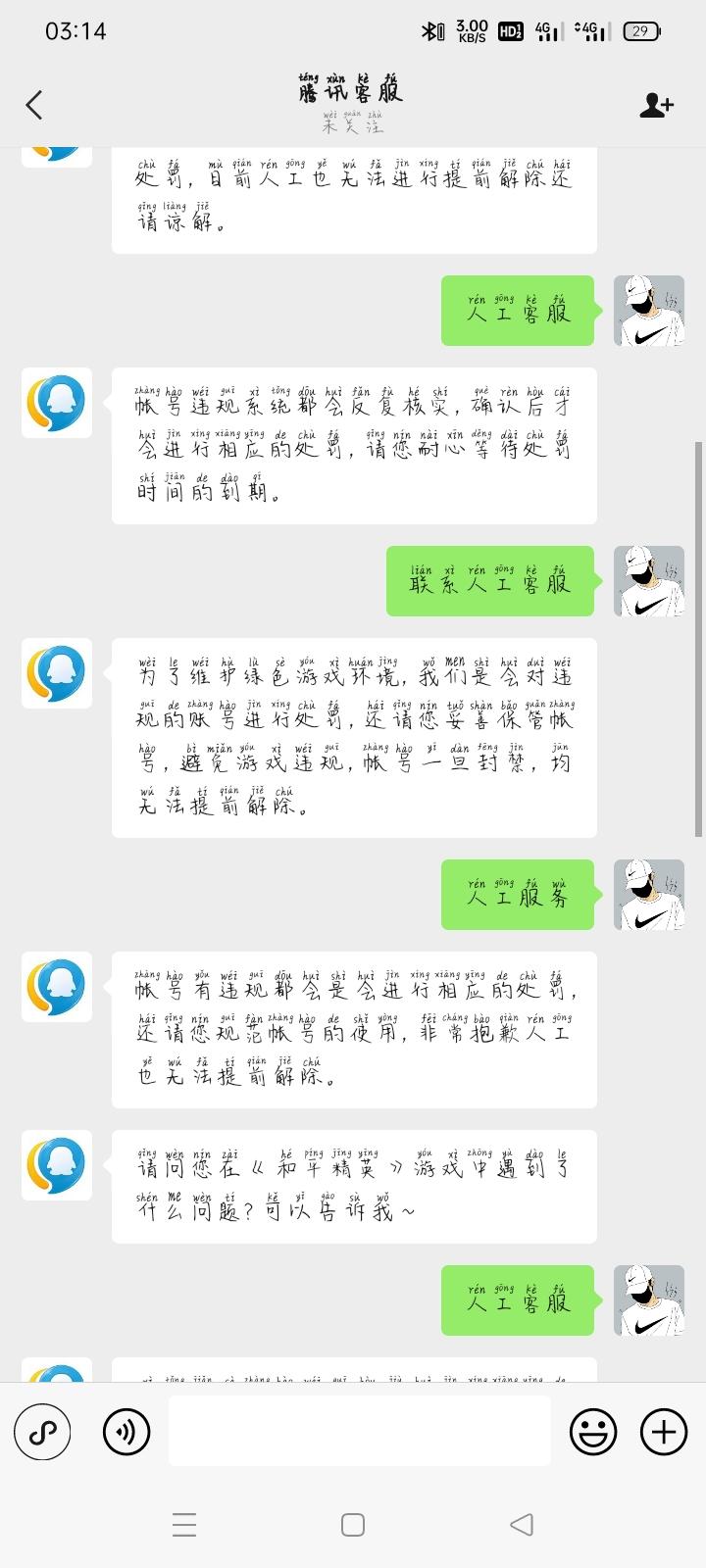 下午还正常的玩游戏,晚上就被封了,我想来想去并没有恶意组队呀,我打的4排随机匹配的队友,怎么会有组队现象呢。去vx问客服,一直都是个机器人,我说我需要人工客服却一直都是机器人。真的很无语,被恶意举报就算了,给我封了就算了,还不给我申诉的机会。@和平精英官方,麻烦好好核实一下,大无语事件