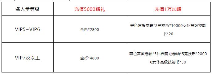 2,【高级名人堂玩家专属礼】 活动时间内,所有线下名人堂VIP5及以上玩家,在活动期间内的充值,达到要求后可以获得额外奖励哟!(只能领取对应VIP等级奖励)