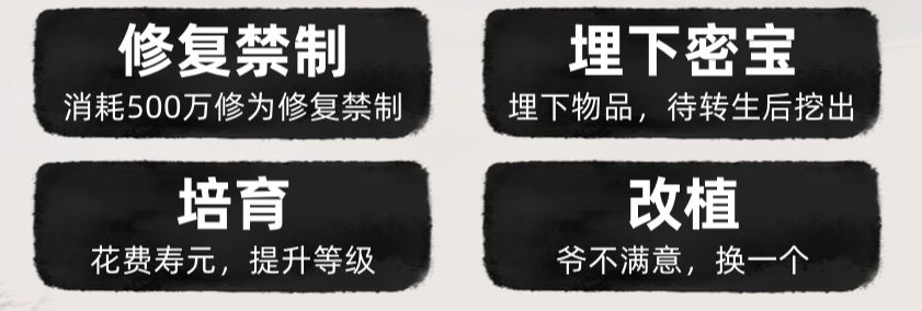 ·禁制:随时间流逝而消耗,消耗完之后树会被破坏/被偷埋宝,前者掉健康值,后者埋宝消失