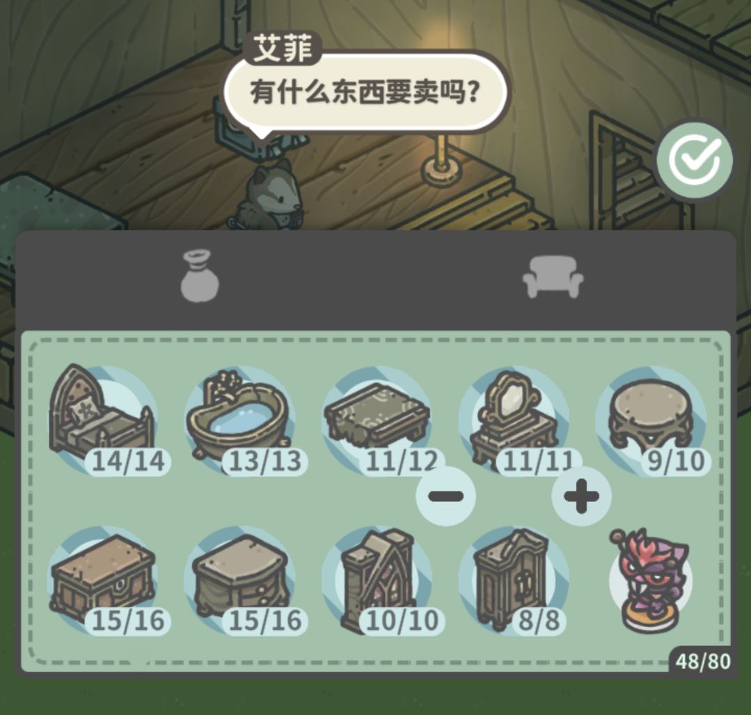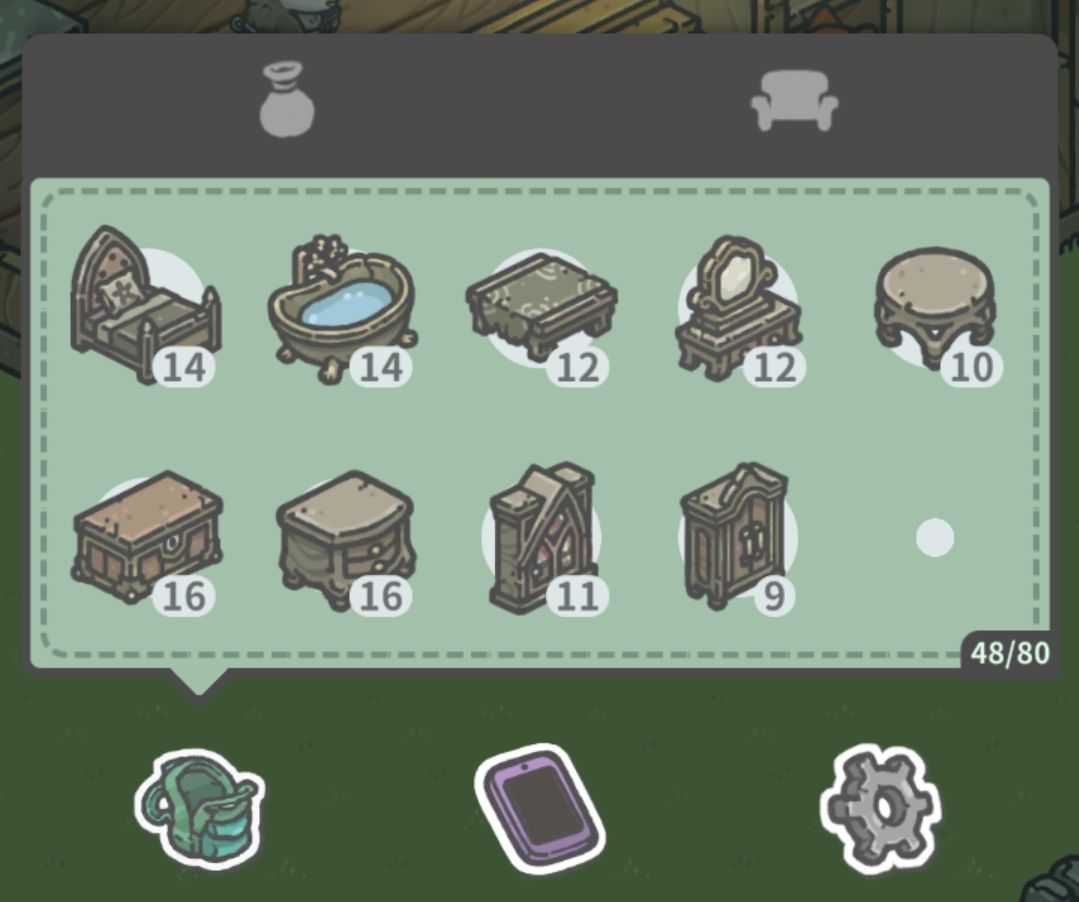 一大堆家具,我甚至等了好久它们进背包的动画。。我每种家具留下了一个,其他都卖掉了