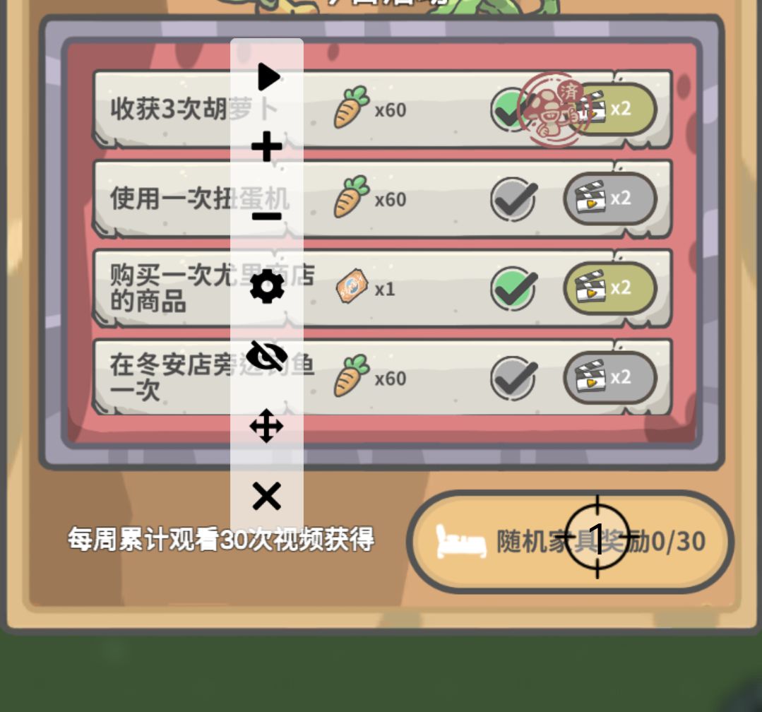 同一个星期看够30个广告后,用连点器对准随机家具奖励,(连点器有关的部分见评论吧)