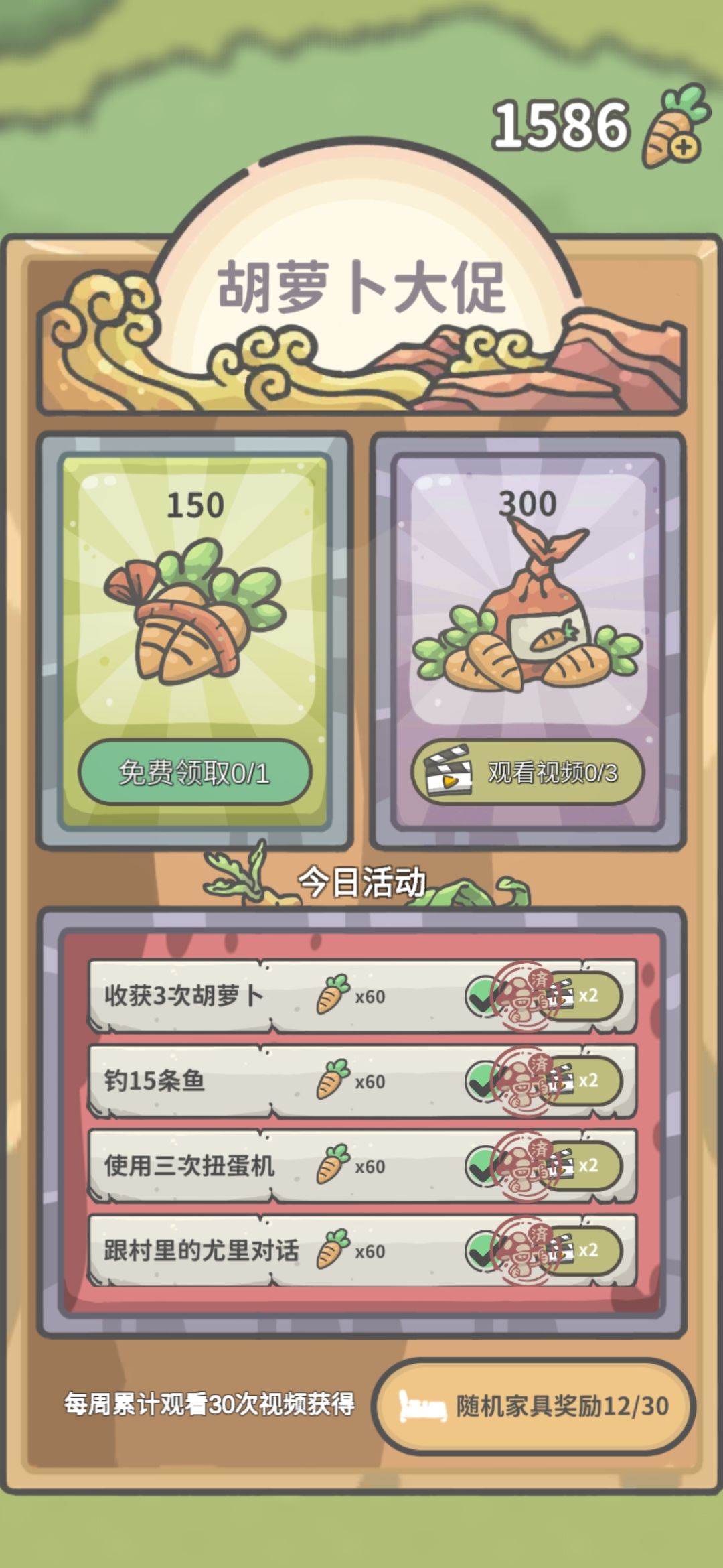 最后就是右上角的萝卜+图标的胡萝卜大促,每天最多可以获得1530个萝卜,下面的今日活动也可能会刷扭蛋券