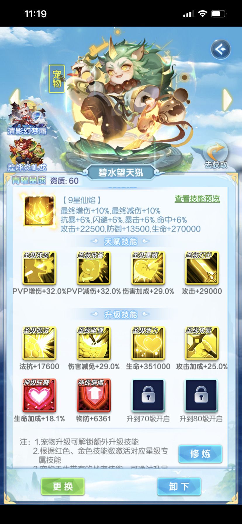 关于宠物,幻彩升星难的很,先集中把主核的技能洗到8金,优先选择跟伤害有关的,再其次是各种加成。