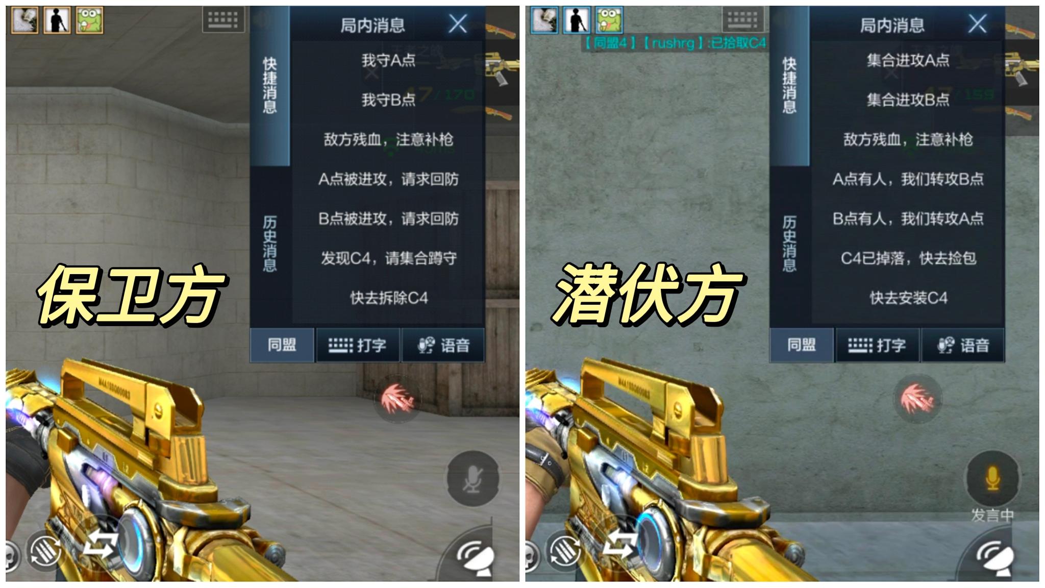现版本的快捷消息如下图,分为保卫方和潜伏方,但是只能体现大局思维,而且现在的玩家通过地图提示的信息,基本可以了解全局的走势。还有历史消息真的没必要占地方的!面对现在的玩家,快捷消息必须做出调整,将下图快捷消息栏变为“A点信息”,将历史消息变为“B点信息”。