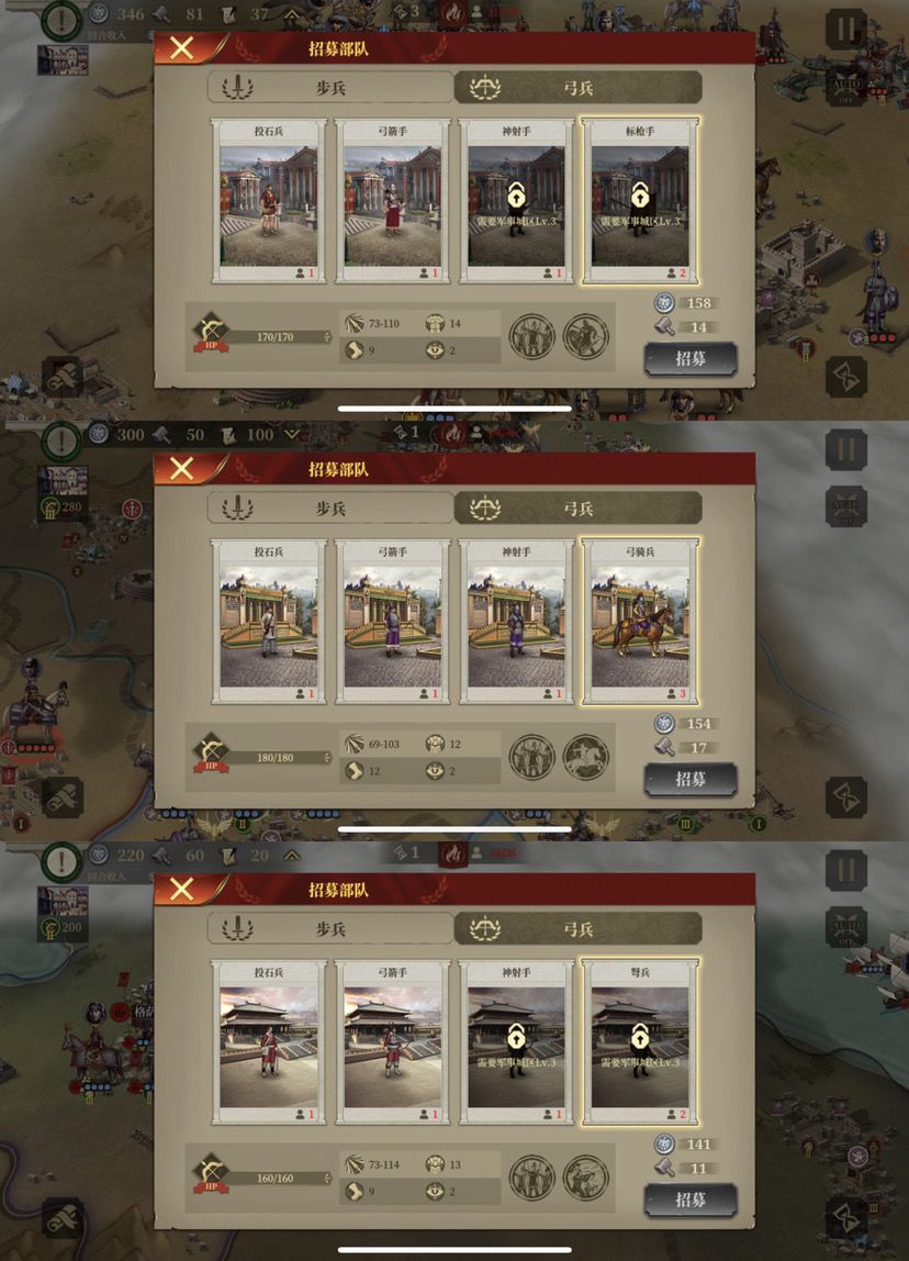 注:同种兵种无论外观、国家,属性都是一样的。马其顿帝国的重装步兵(或者其他兵种)和东罗马帝国(或者其他国家)的重装步兵没有区别。