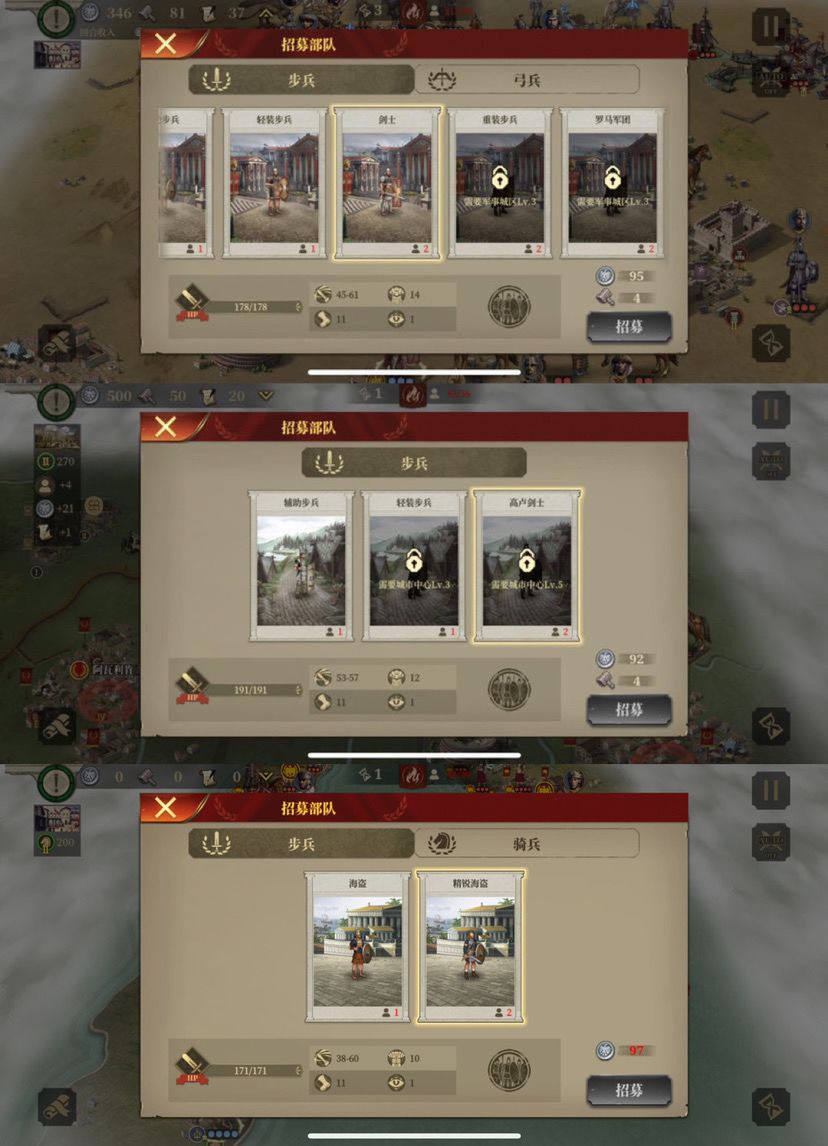 以上就是游戏里全部的常规兵种和战舰了。需要注意的是,罗马军团和战士的攻击方式是挥砍,不是穿刺,不要被他们的攻击动画骗了。