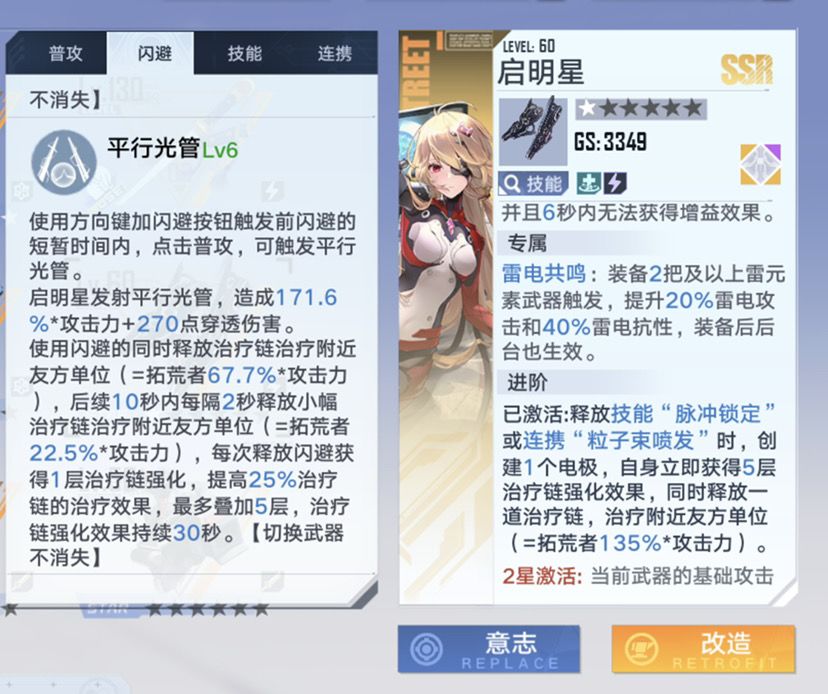 1星的质变不仅是这些,在释放技能或者连携技的同时会奖励一道(=135%*攻击力)+100%治疗链效果的治疗链,这就又省下了两个闪避,正常闪避治疗链是(=67.7%*攻击力)+25%治疗链效果,1星的治疗链是(=135%攻击力)+100%治疗链效果。