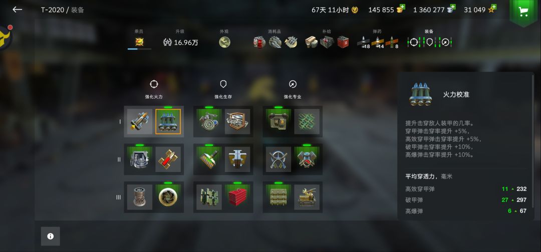 在装备页中,我推荐下图配置,加穿深在上面已经说明了理由,加甲的目的是防止被7-8级mt和部分ht乱穿首上,同时加强炮塔两侧脸颊厚度。点精度是因为点缩圈的话就减少0.4s还是0.3s,不如点精度划算。
