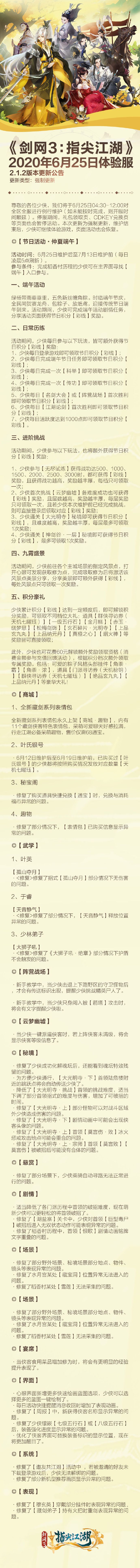 《剑网3:指尖江湖》2020年6月25日先锋测试2.1.2版本更新公告