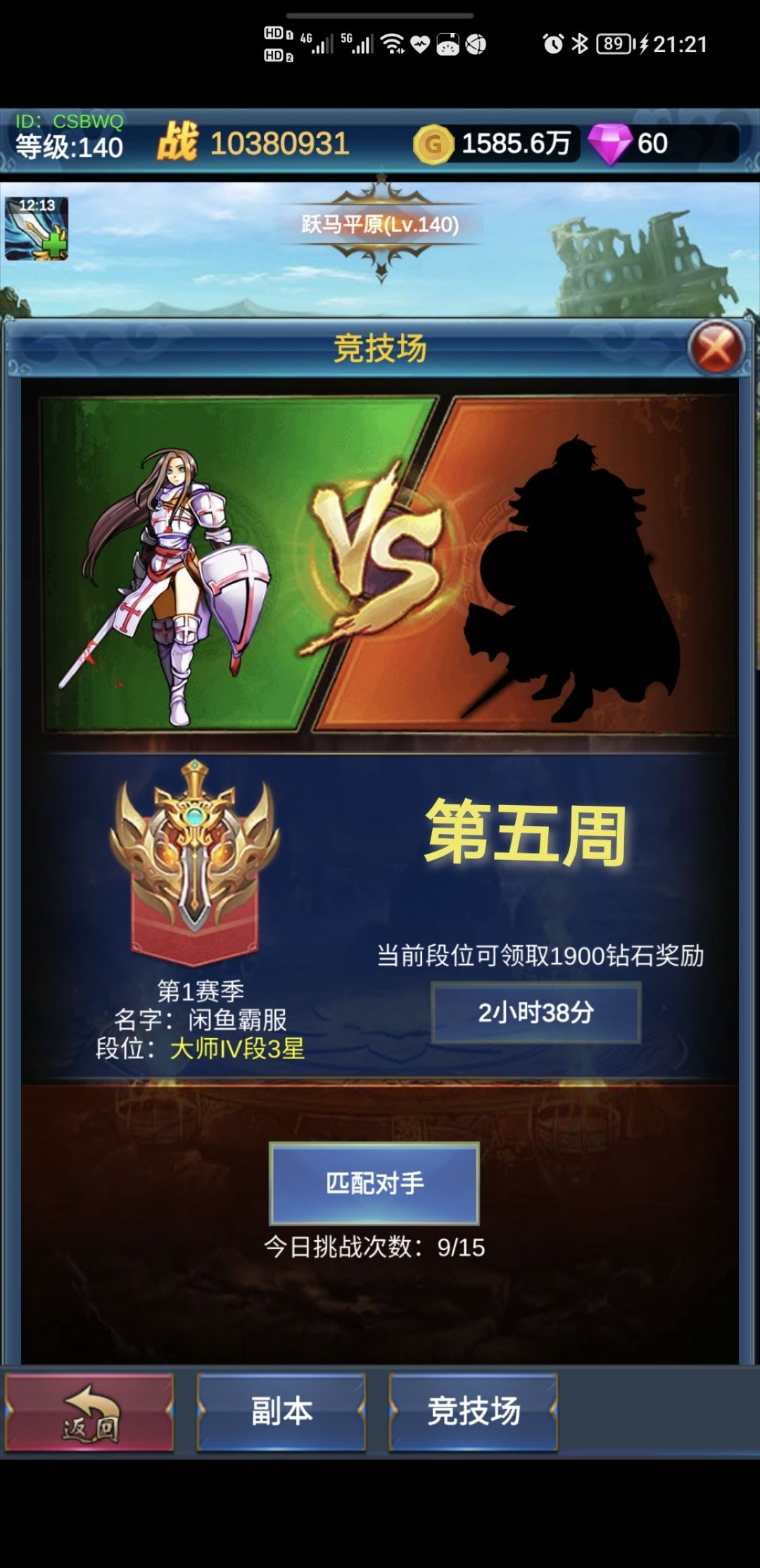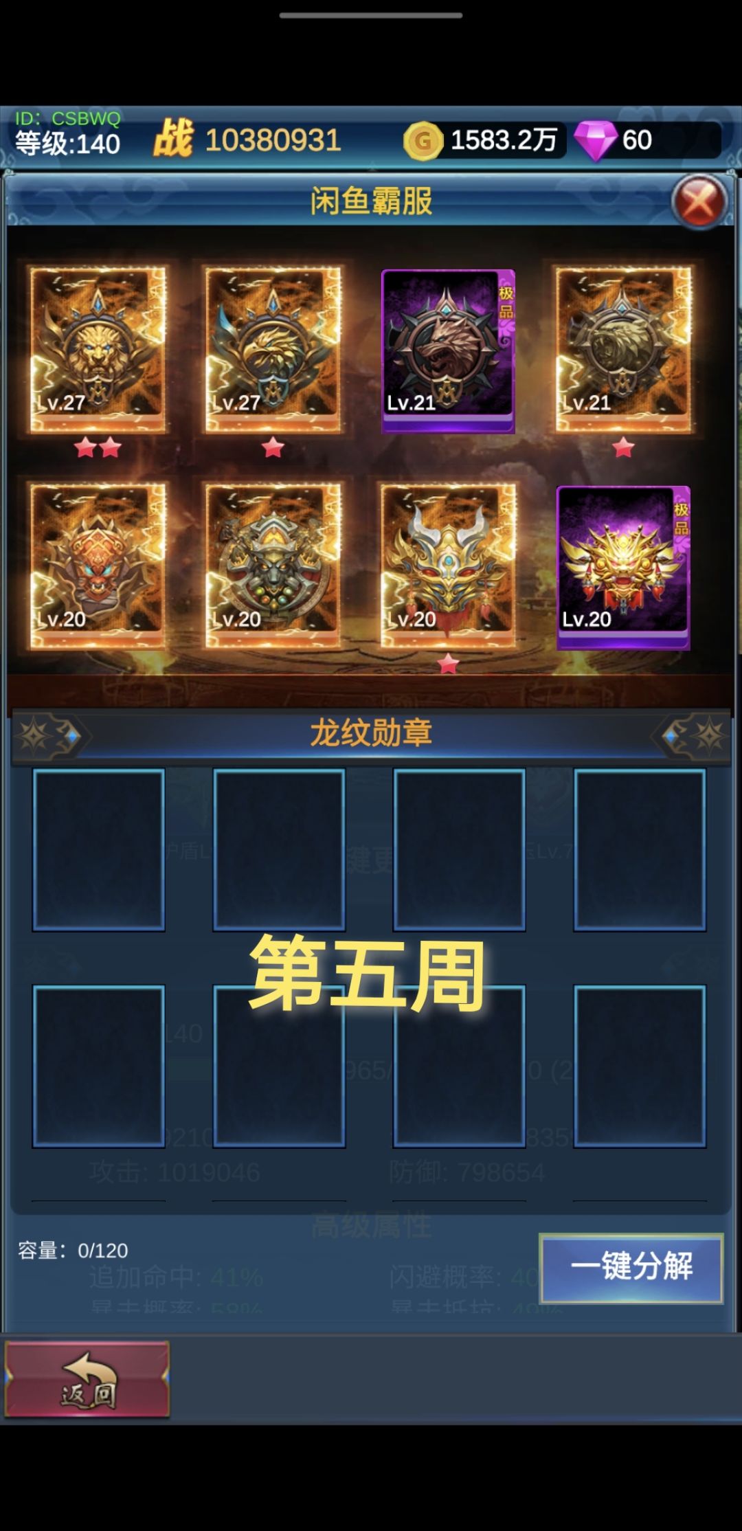 第五周,等级140级,战力1038万,通天塔196关,封魔战场73关,竞技场大师四段3星。