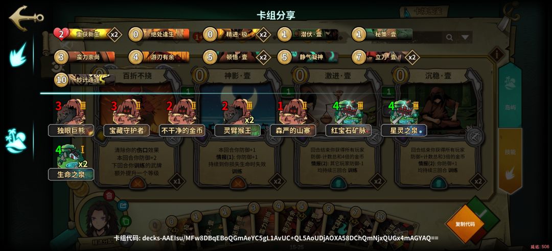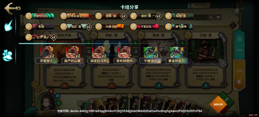 隐忍增强偷钱buff,大量的忍牌可以保证情报的数量,抗性可观,但是千变万化不一定抽到隐忍,稳定性中,生存高。
