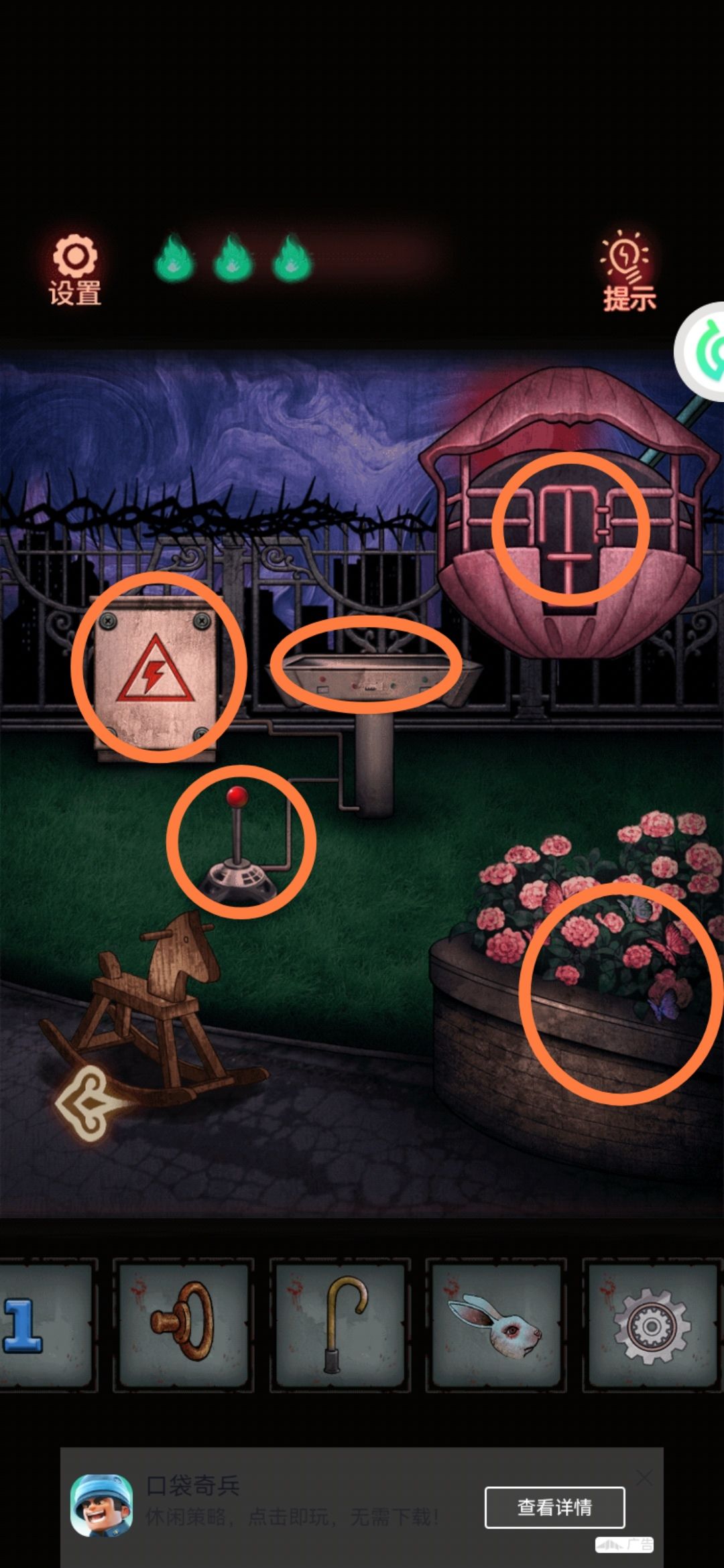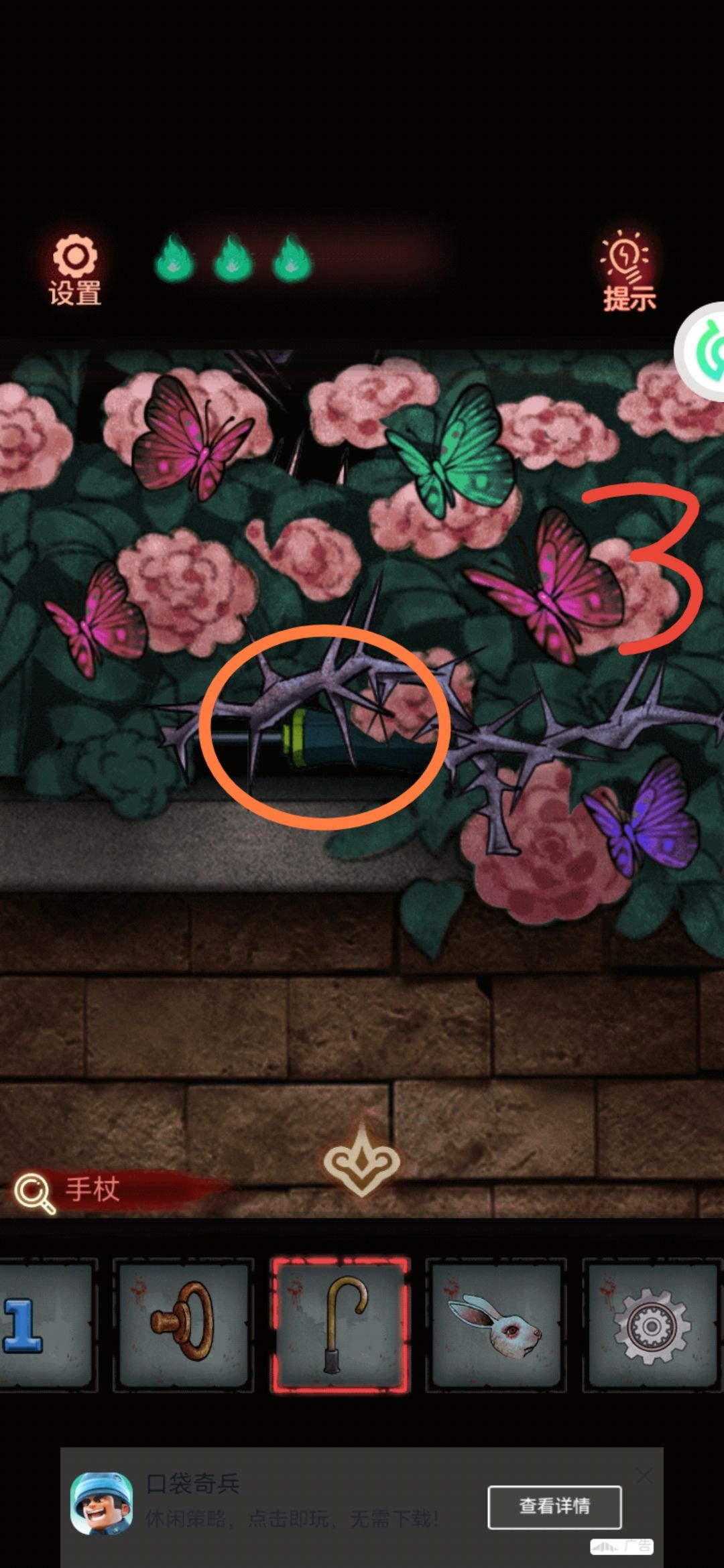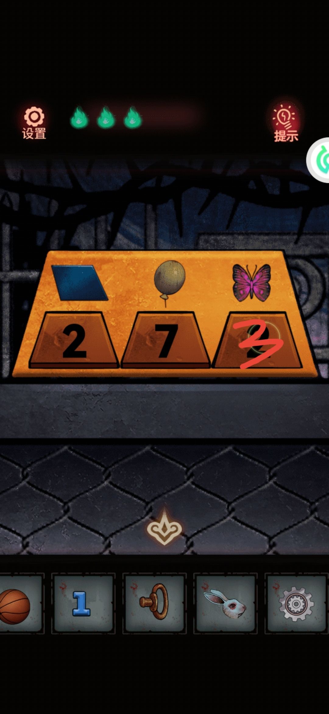 花坛里有什么东西,用拐杖把荆棘挑开,拿到螺丝刀。顺便数一下花坛里有粉蝴蝶3,中间场景有3个黄气球,左边场景4个一共7个,篮球机前面蓝砖2。所以篮球机的密码:273。