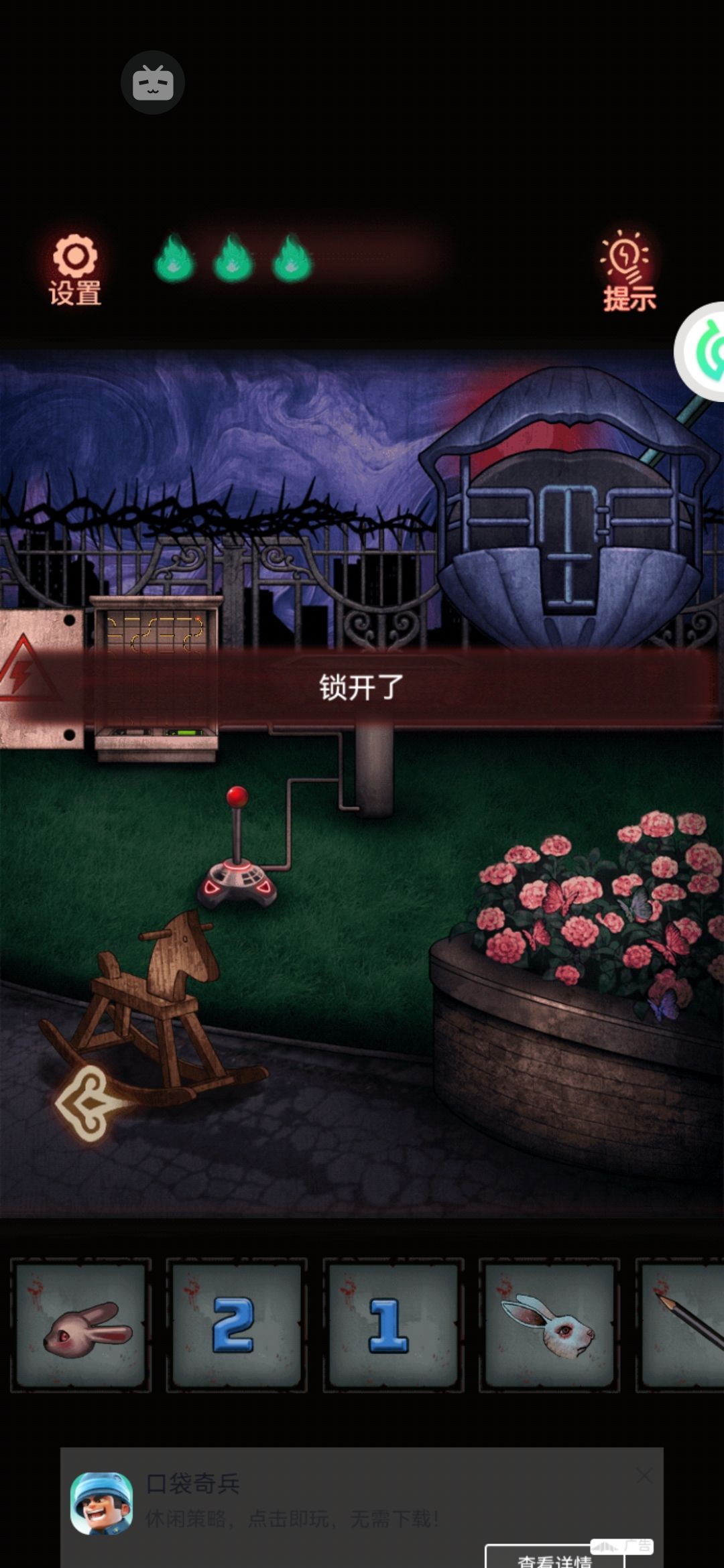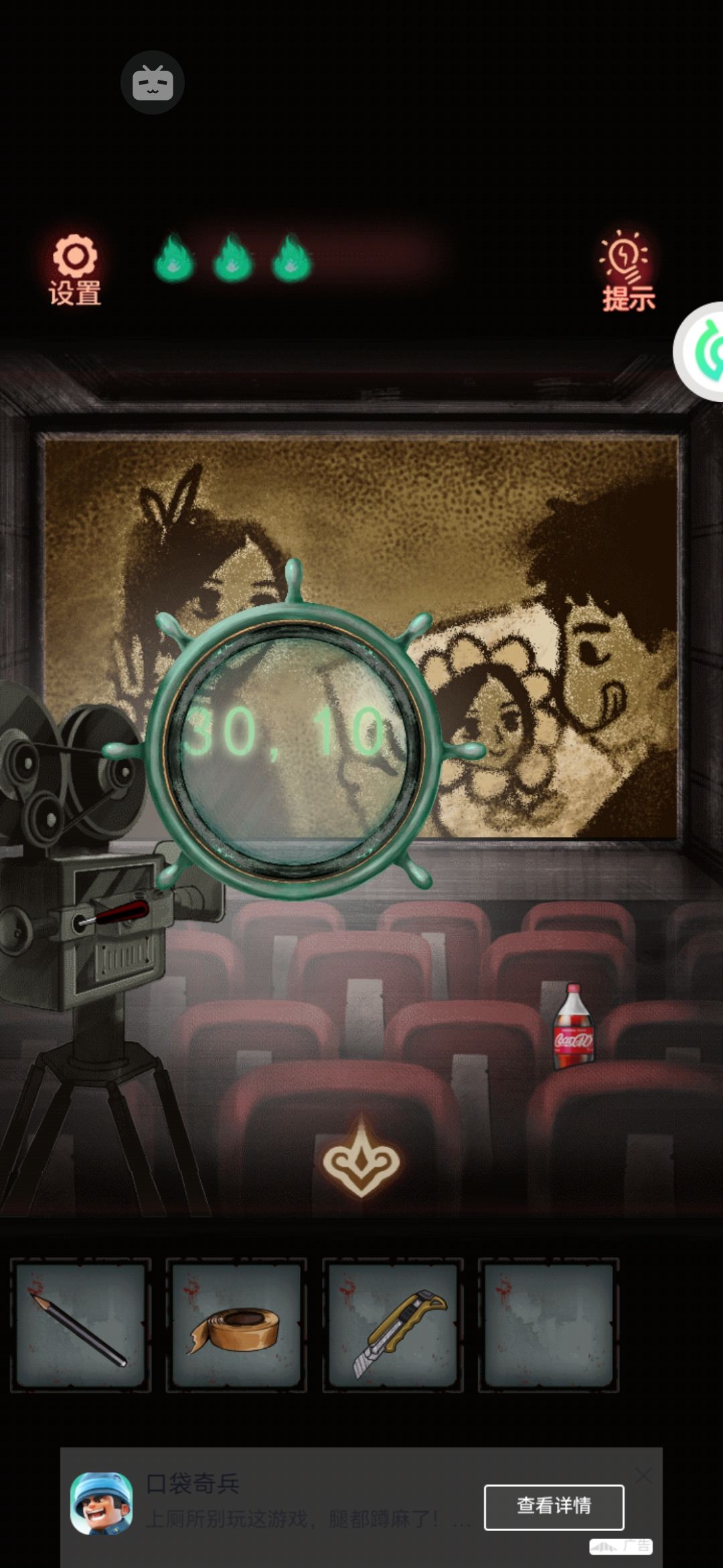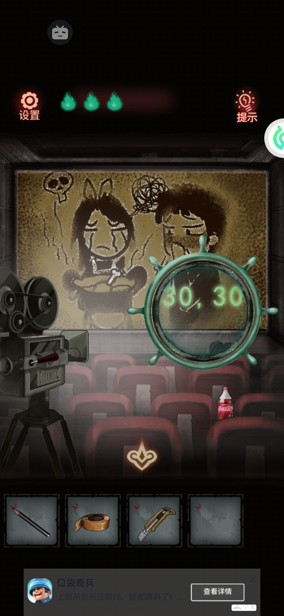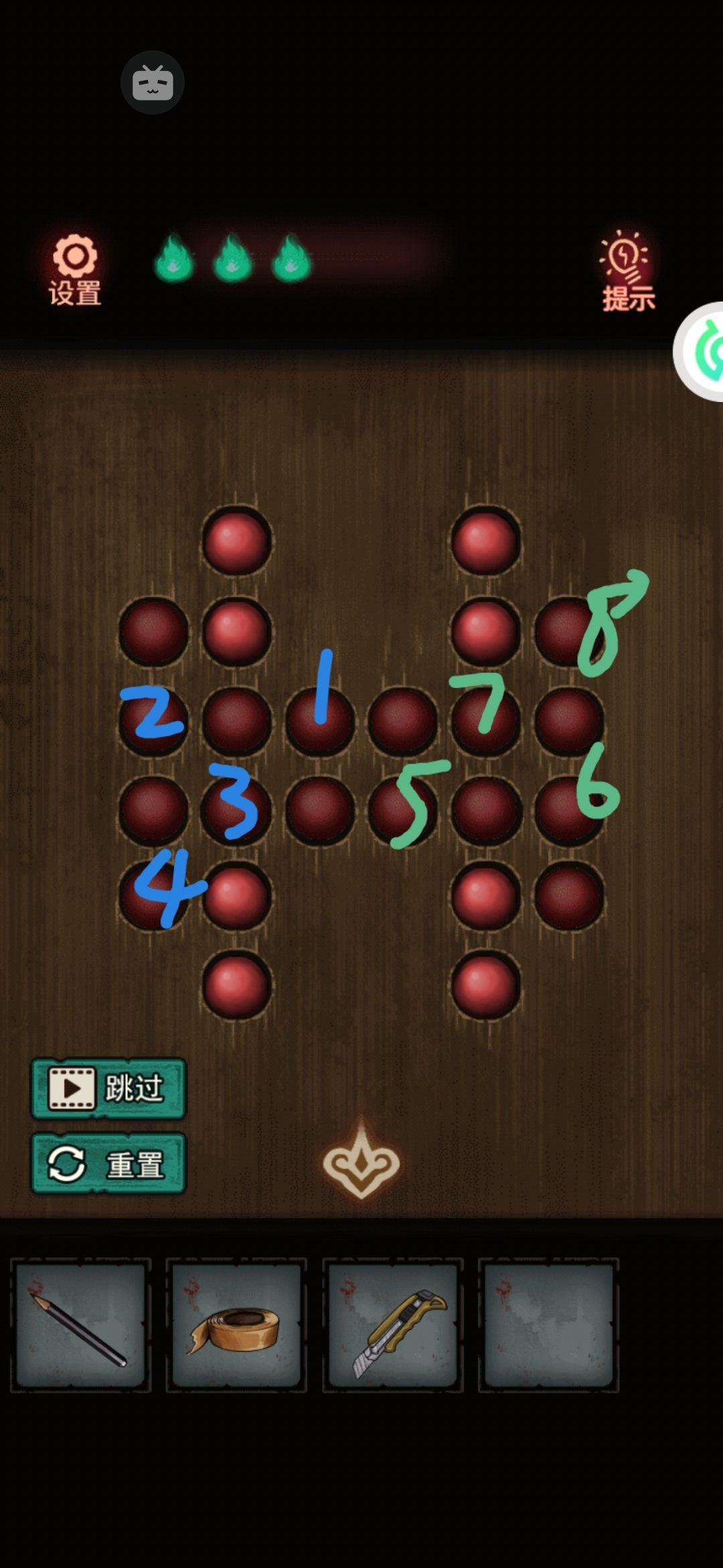 8。中间有个九宫格拼图,把第一行的123按顺序先排好,然后推过去。下面的就好弄了。解开拿中间的发条。用美工刀把门右上角的绳子割破,(⚠️⚠️⚠️高能预警告⚠️⚠️⚠️会掉下来一个娃娃突脸)捡了掉下来的蜡烛1。