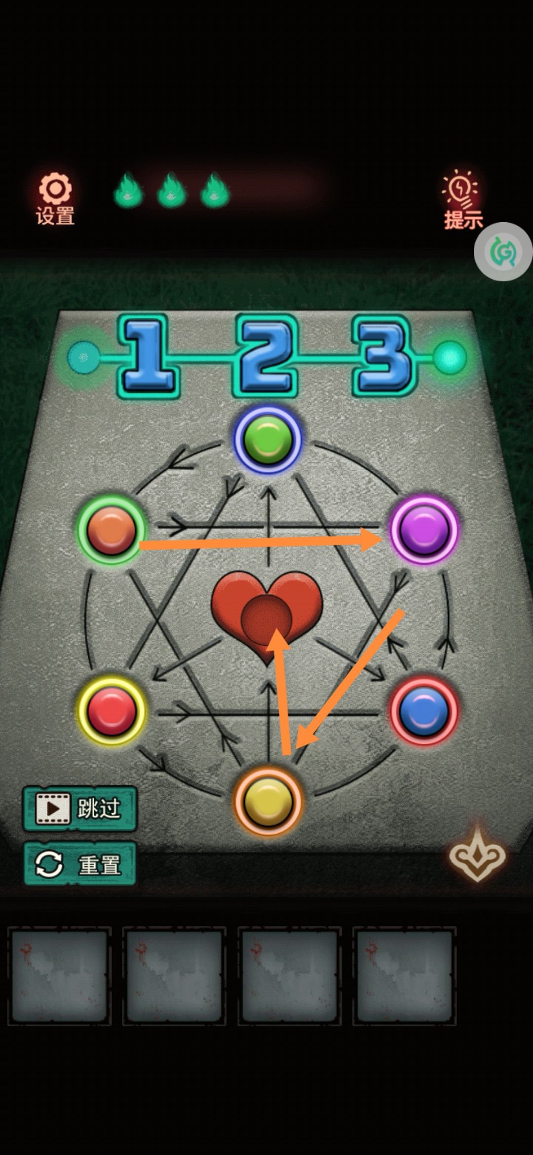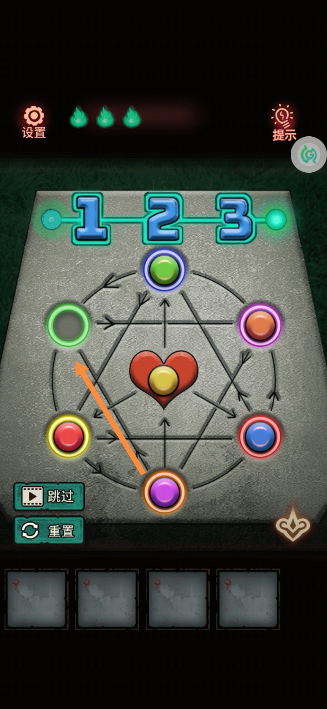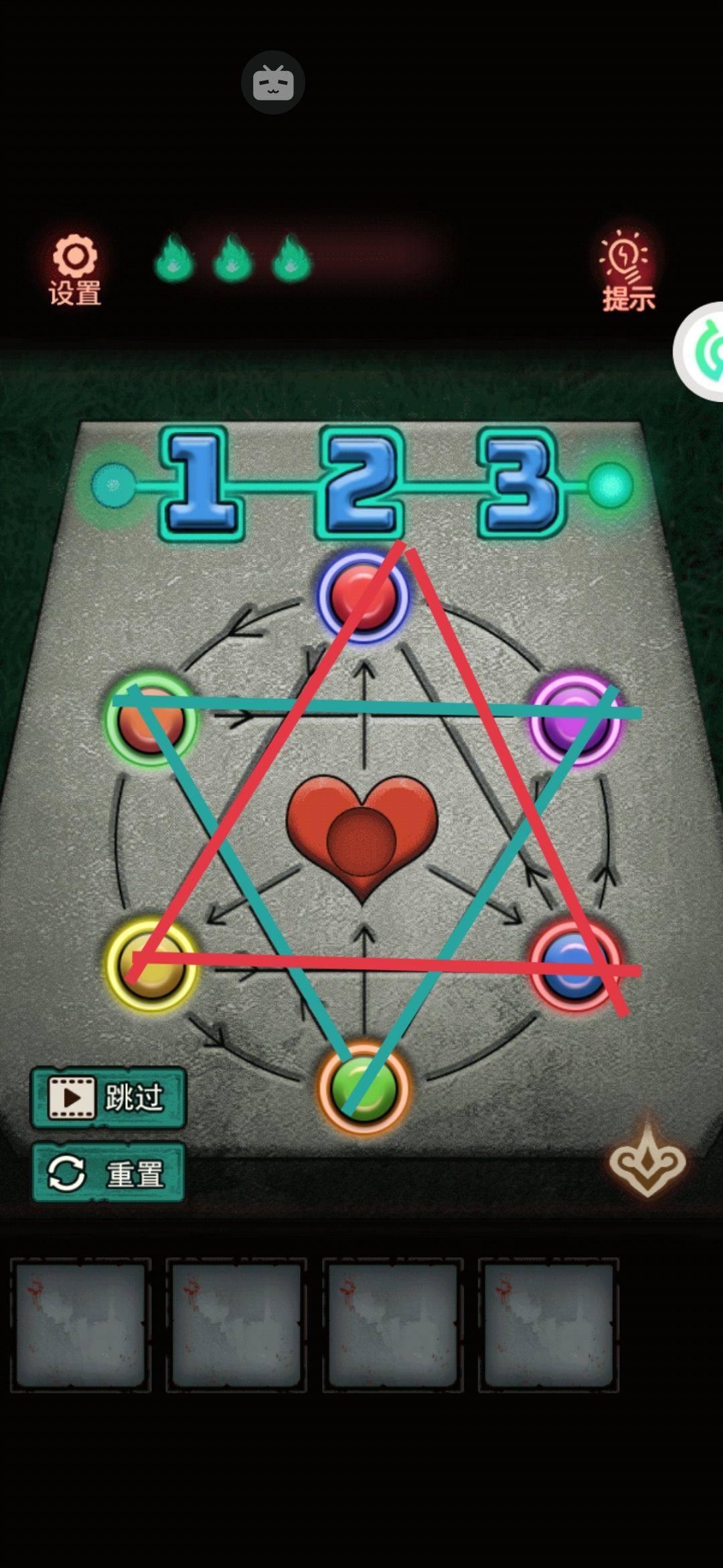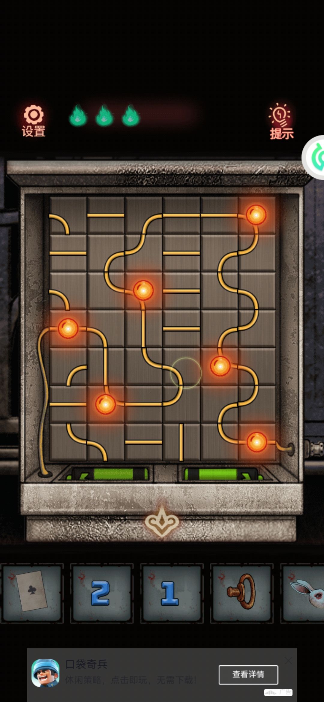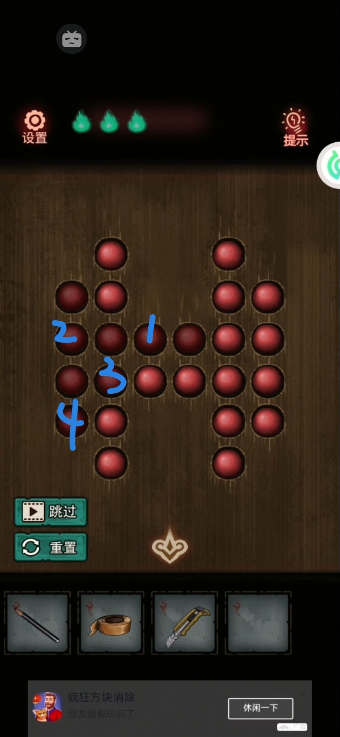 8。中间有个九宫格拼图,把第一行的123按顺序先排好,然后推过去。下面的就好弄了。解开拿中间的发条。用美工刀把门右上角的绳子割破,(⚠️⚠️⚠️高能预警告⚠️⚠️⚠️会掉下来一个娃娃突脸)捡了掉下来的蜡烛1。