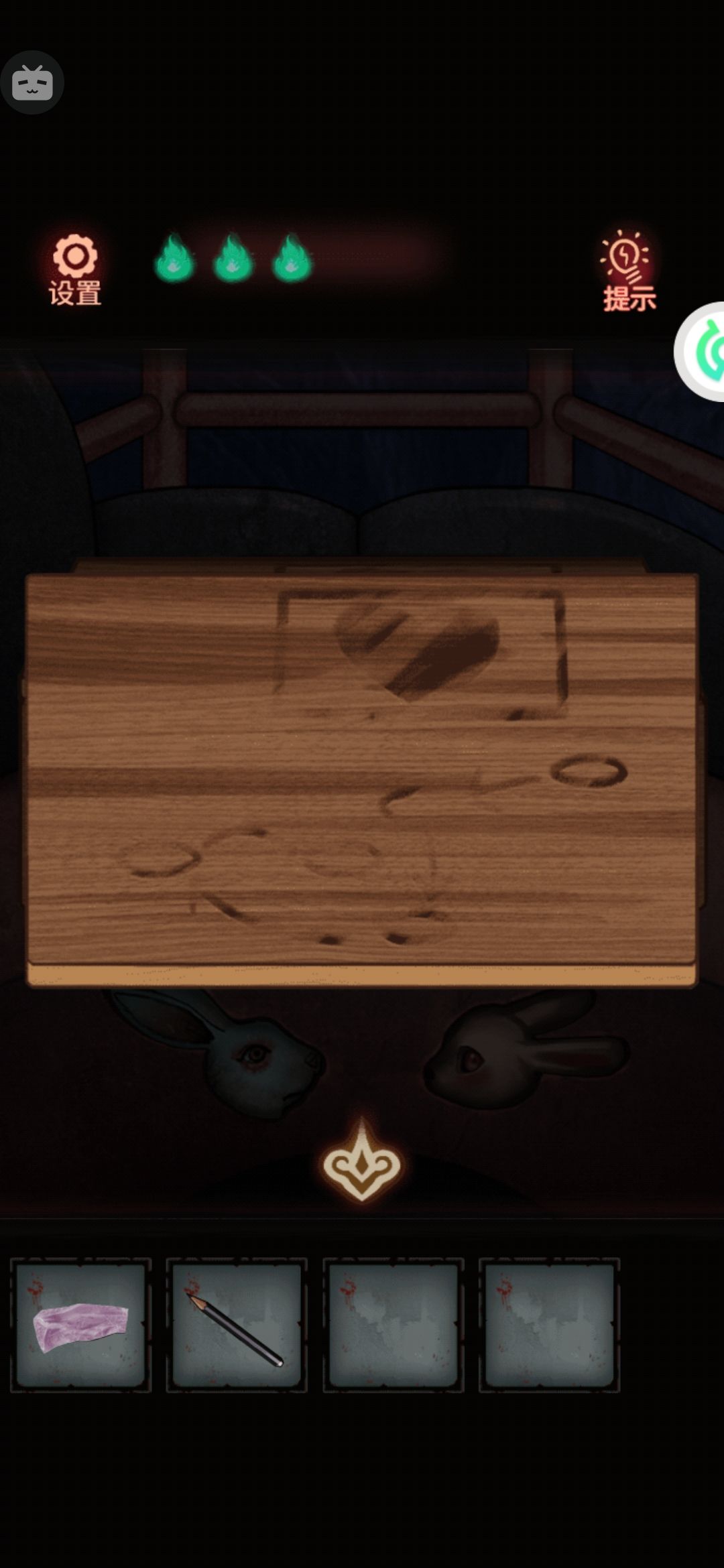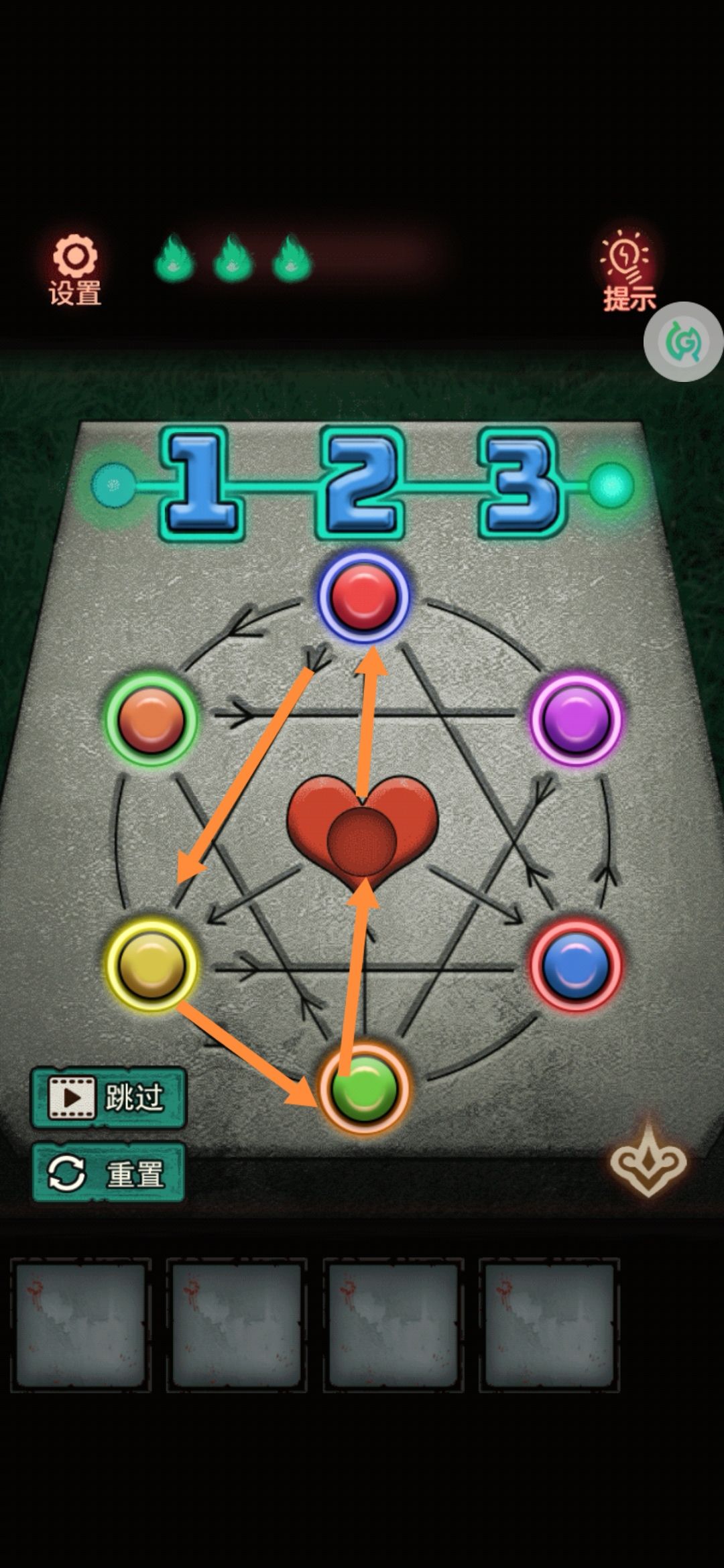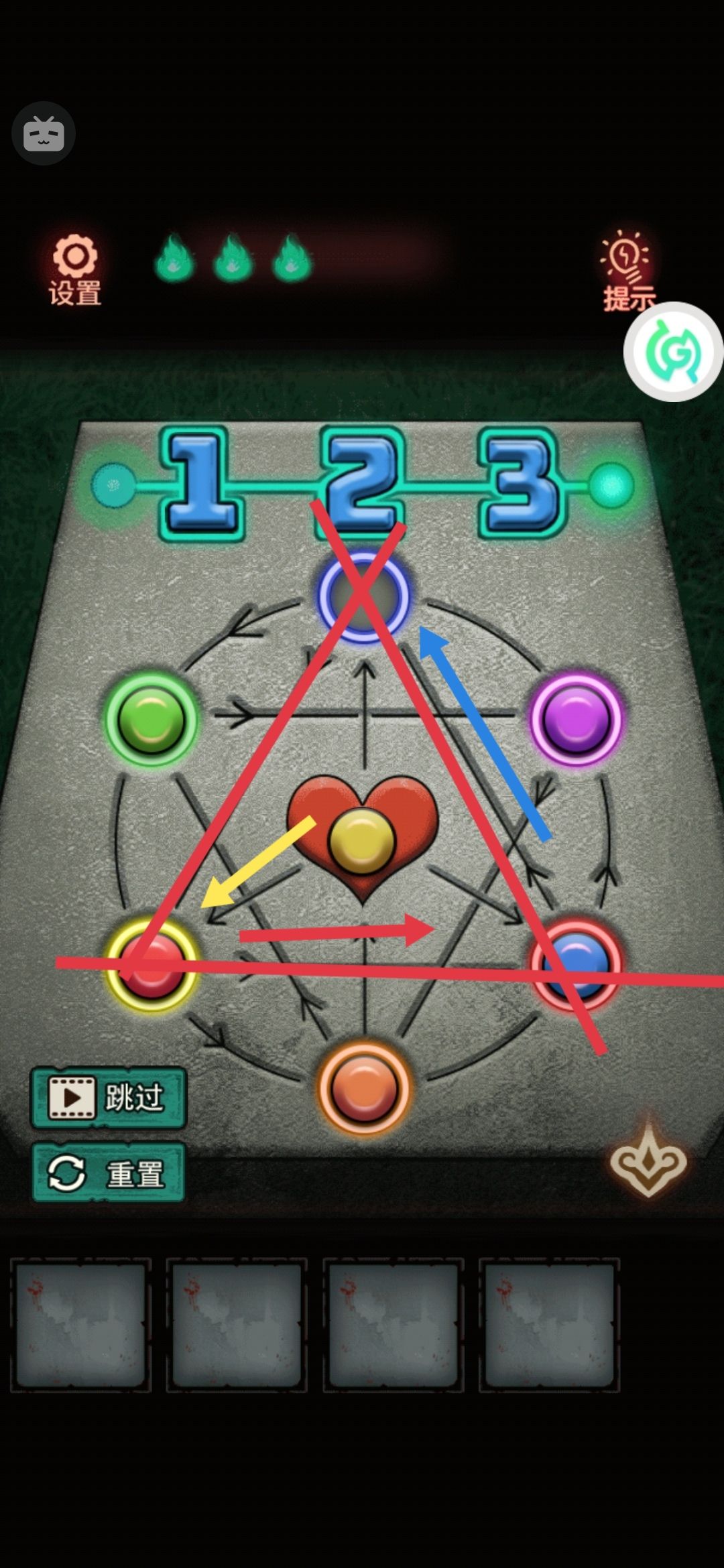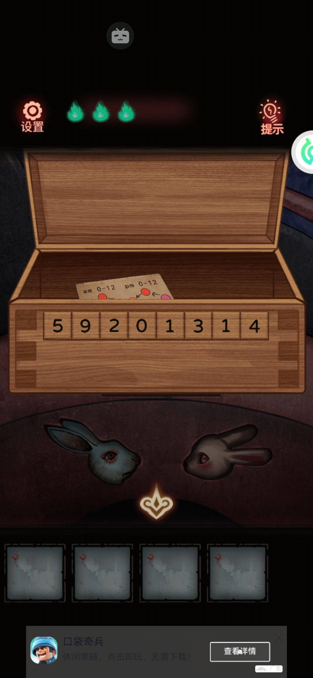 8。中间有个九宫格拼图,把第一行的123按顺序先排好,然后推过去。下面的就好弄了。解开拿中间的发条。用美工刀把门右上角的绳子割破,(⚠️⚠️⚠️高能预警告⚠️⚠️⚠️会掉下来一个娃娃突脸)捡了掉下来的蜡烛1。