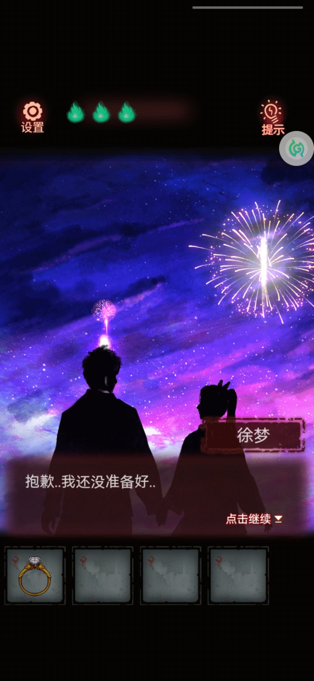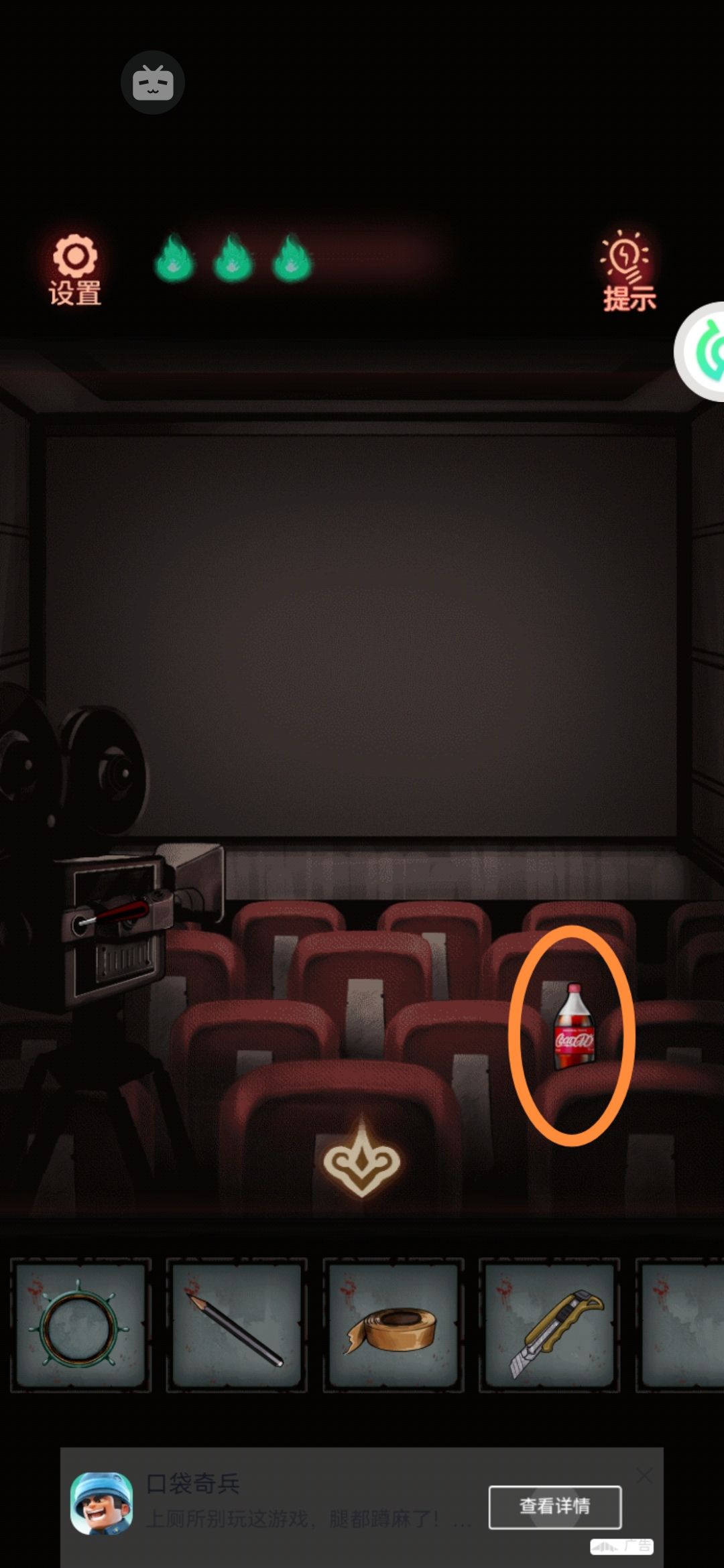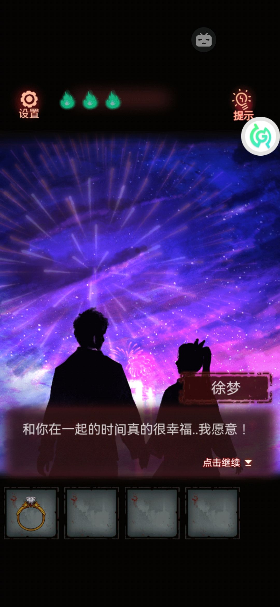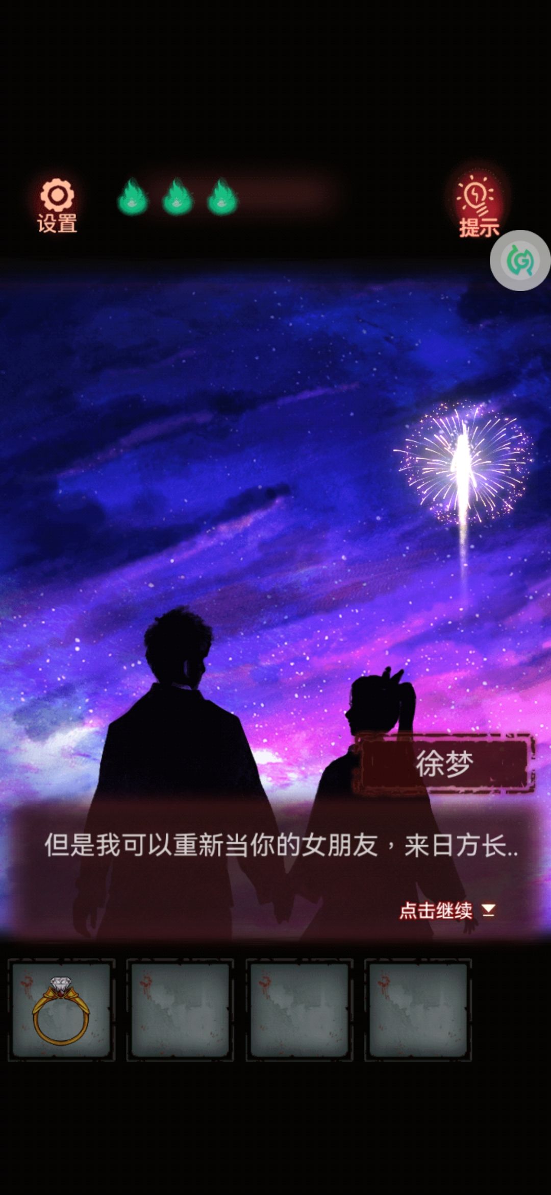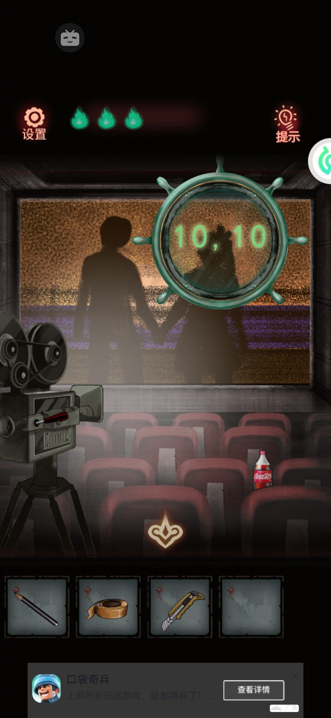 4。拿着电影票,出门去右边的检票口,老奶奶就给我们开了门。进去先捡一瓶可乐(绝对不是 我渴了)!点击左边的放映机,荧幕上播放我们的回忆:看日出,画像,做饭,整蛊。原来这都是我们的回忆啊!我们这么恩爱怎么会分手呢?
