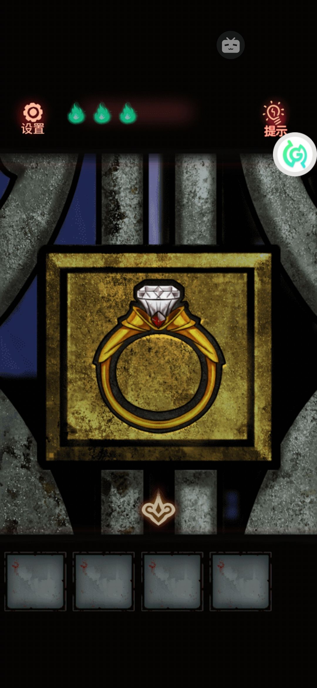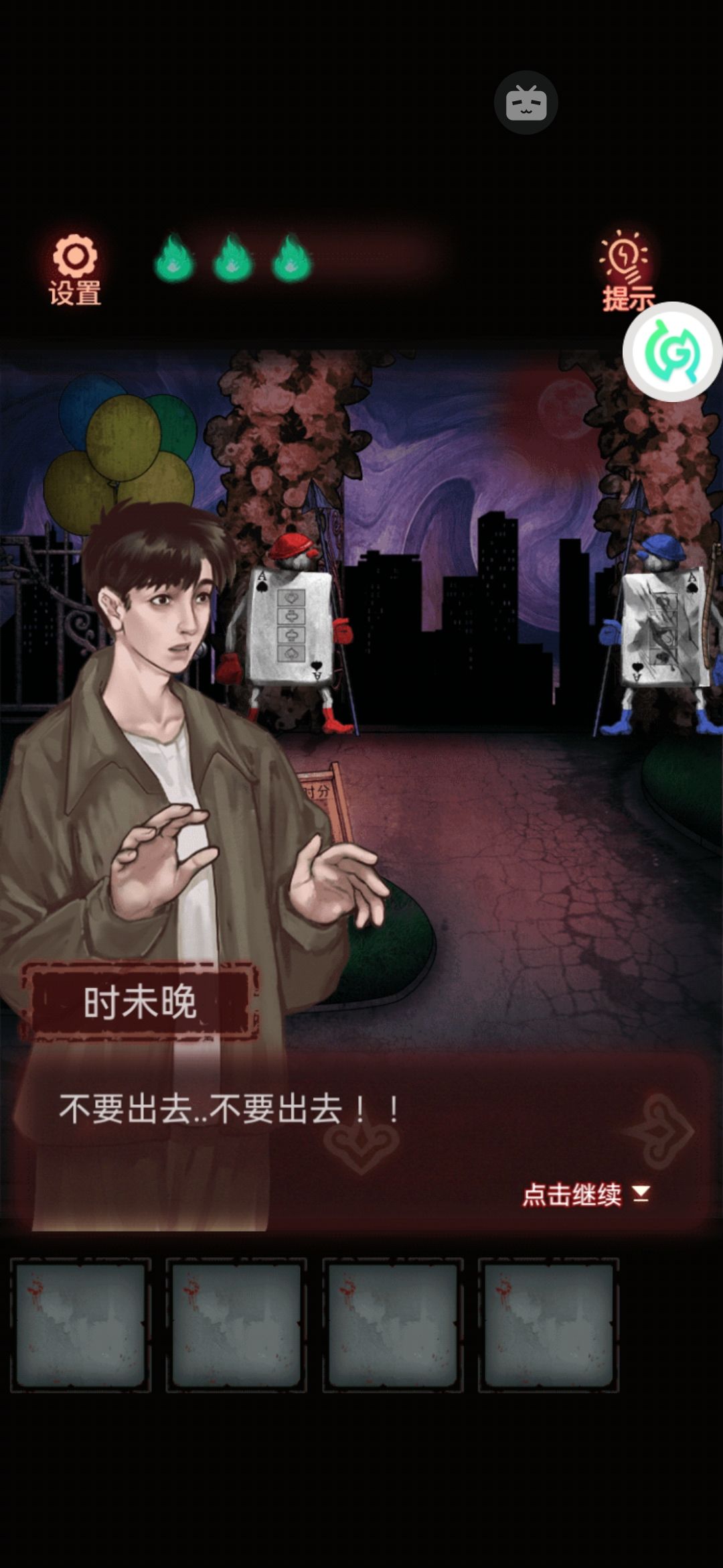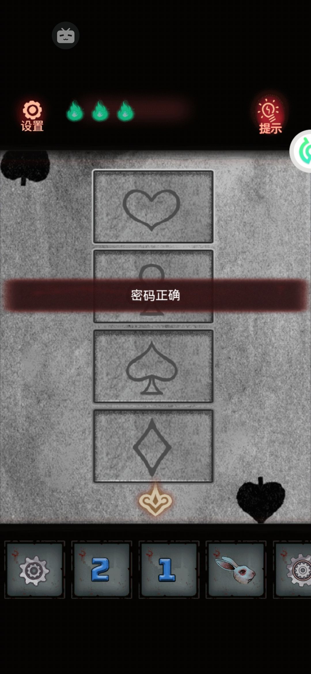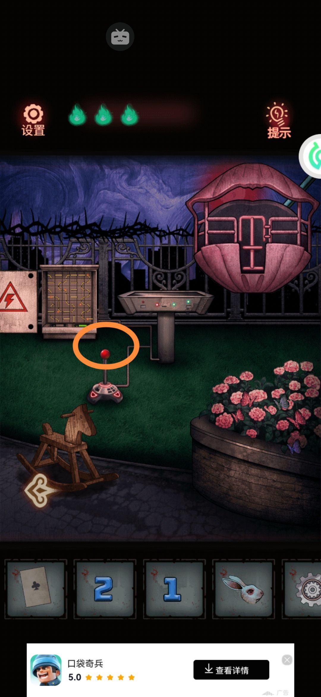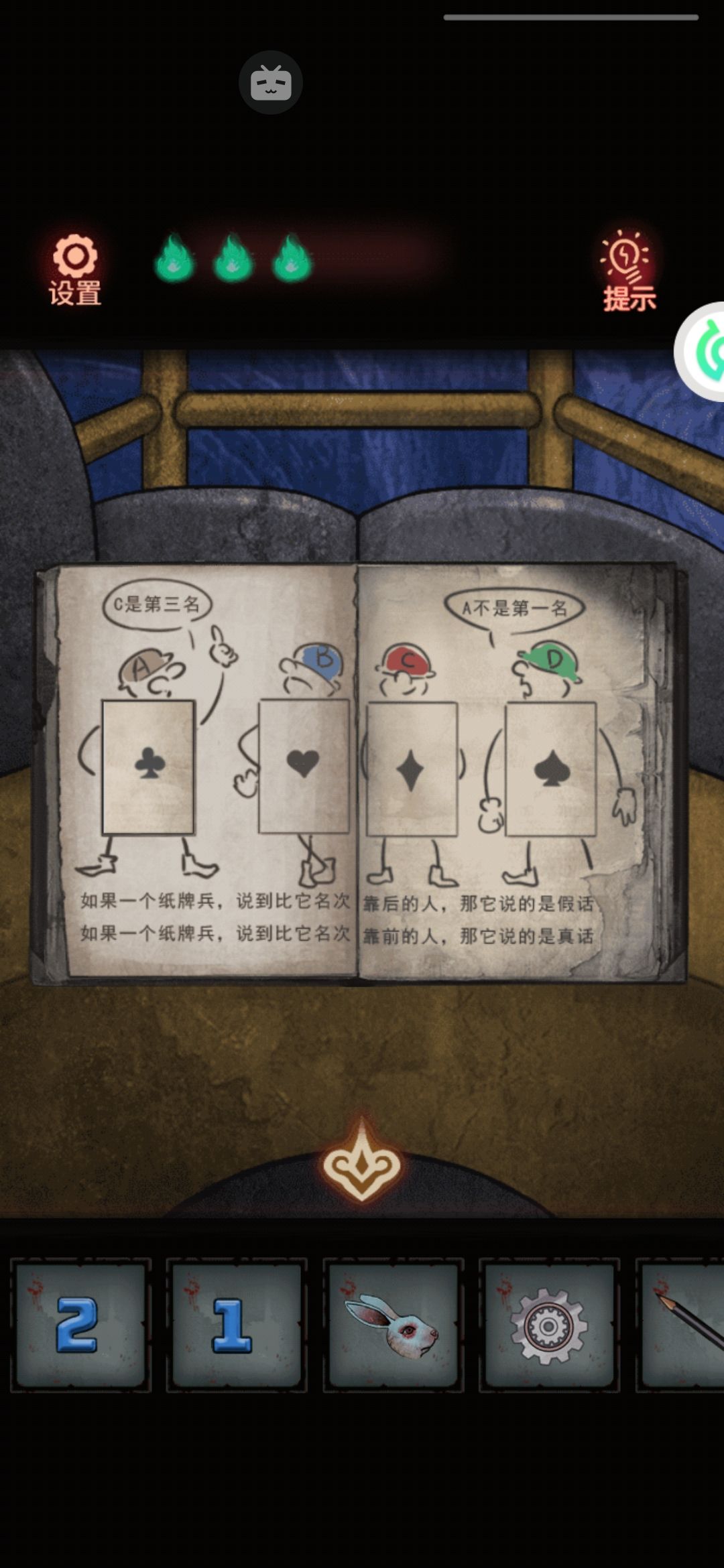 到越游乐园大门的左边那个扑克守卫上输入,注意花色是正着的。这时候守卫把门露了出来。需要一个戒指一样的钥匙。