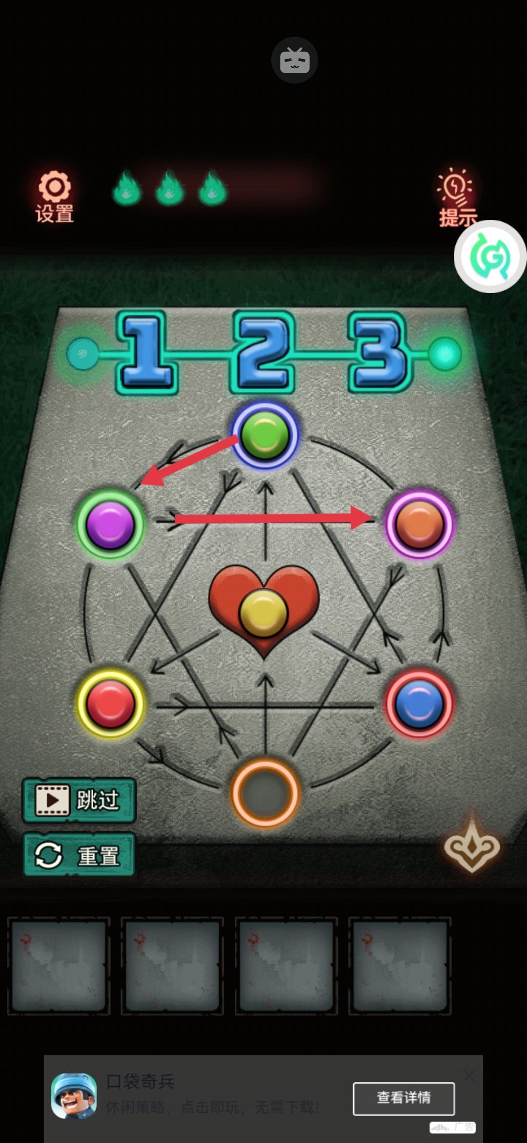 2。礼盒桌子旁边有个红球阵,正好差一个红球,把刚刚的红球安上去之后发现是要全部按下去。