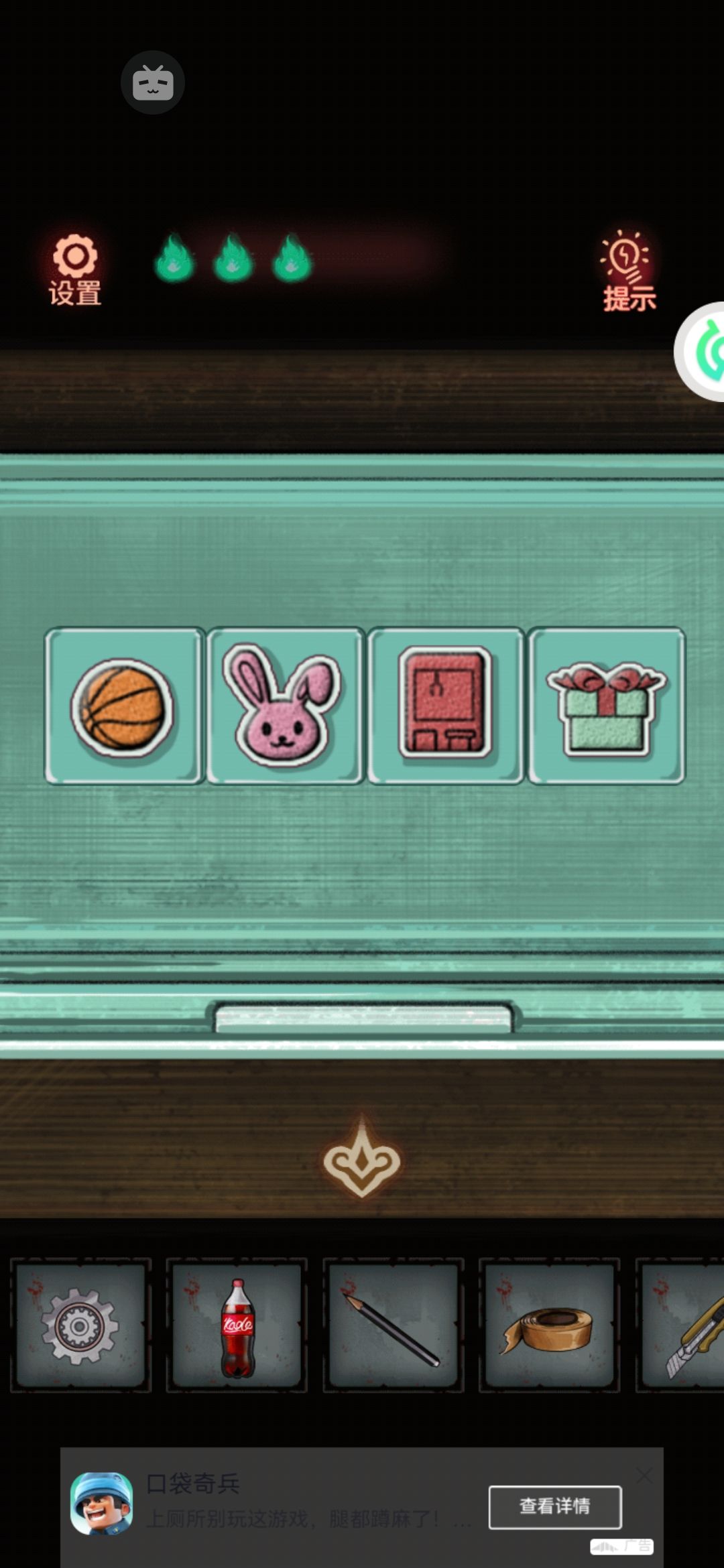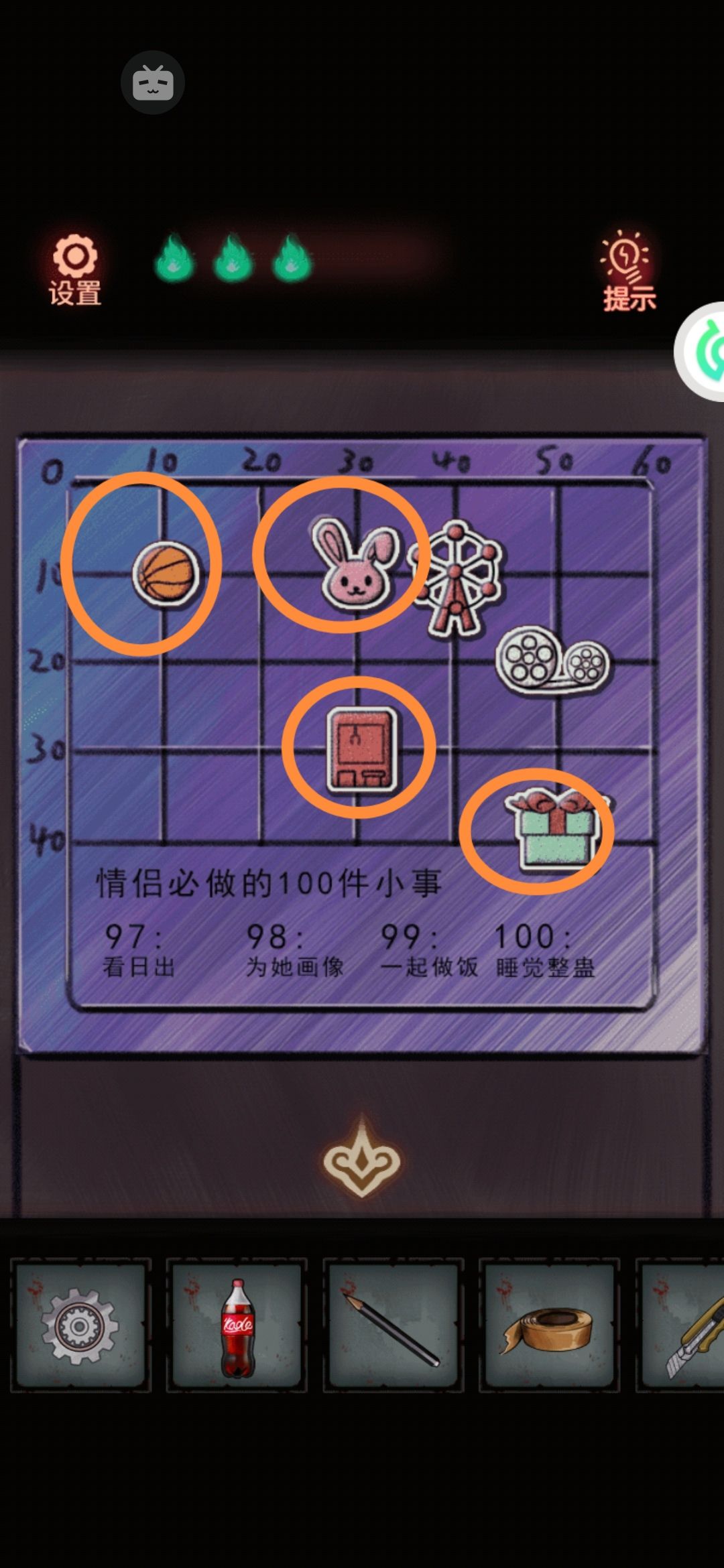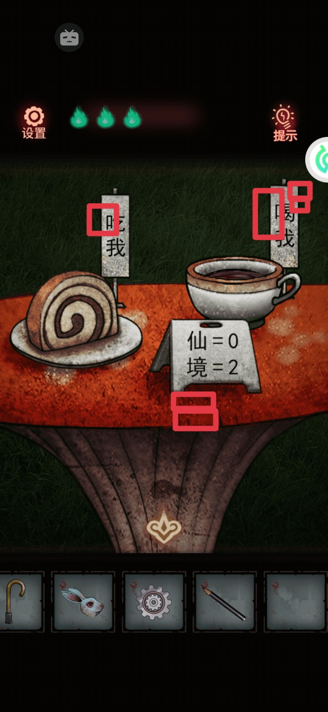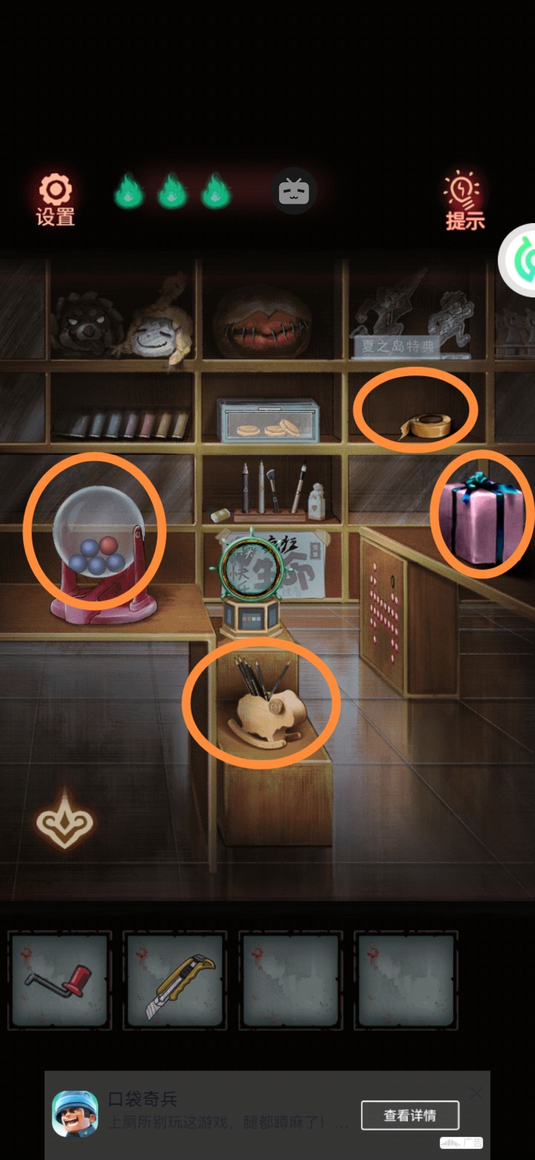 9。来左边。蘑菇桌上有个杯子,给她装上刚才顺的可乐。旁边的字牌就出现了字还有提示。每个字里“口”的个数就是答案,所以来到旁边的礼帽四个字含“口”量为1030 。礼帽打开,拿到篮球。