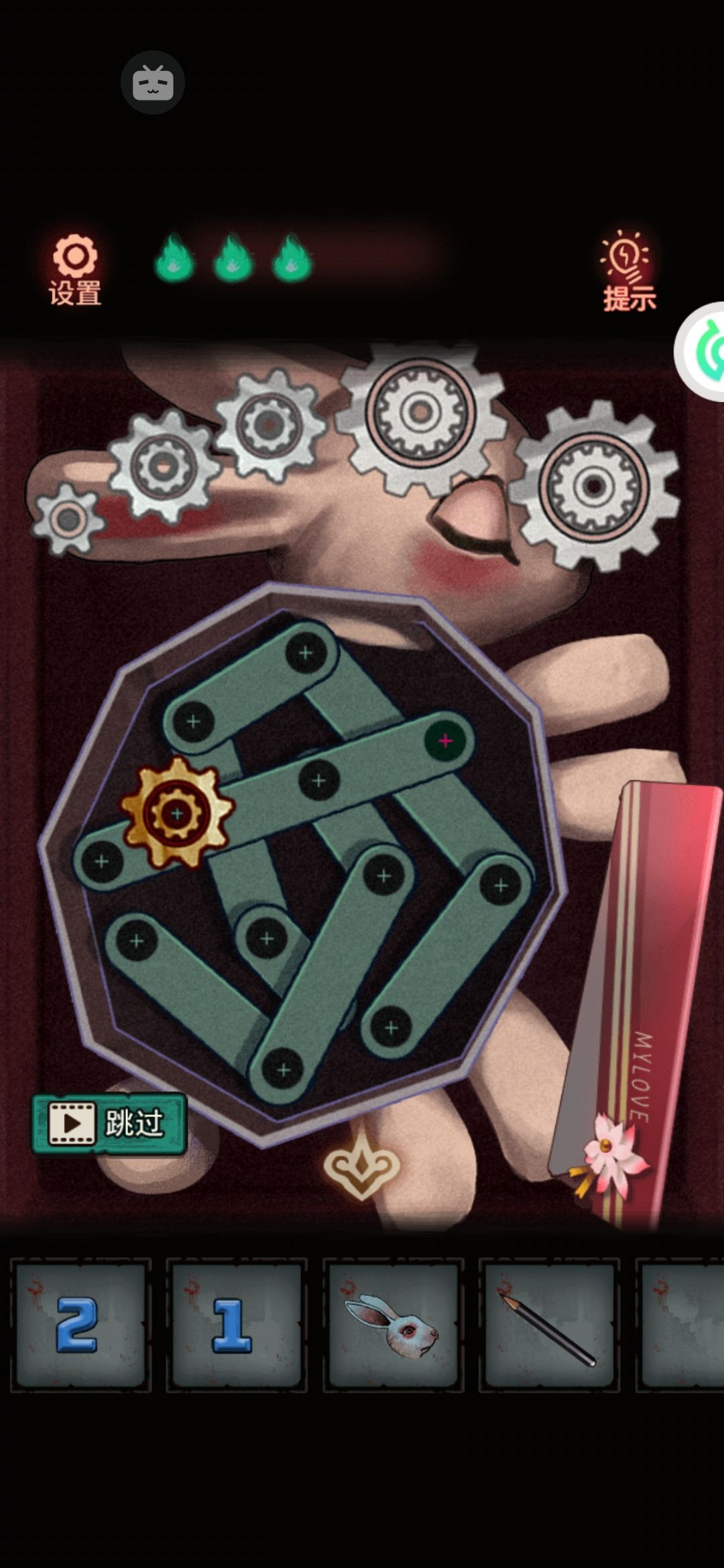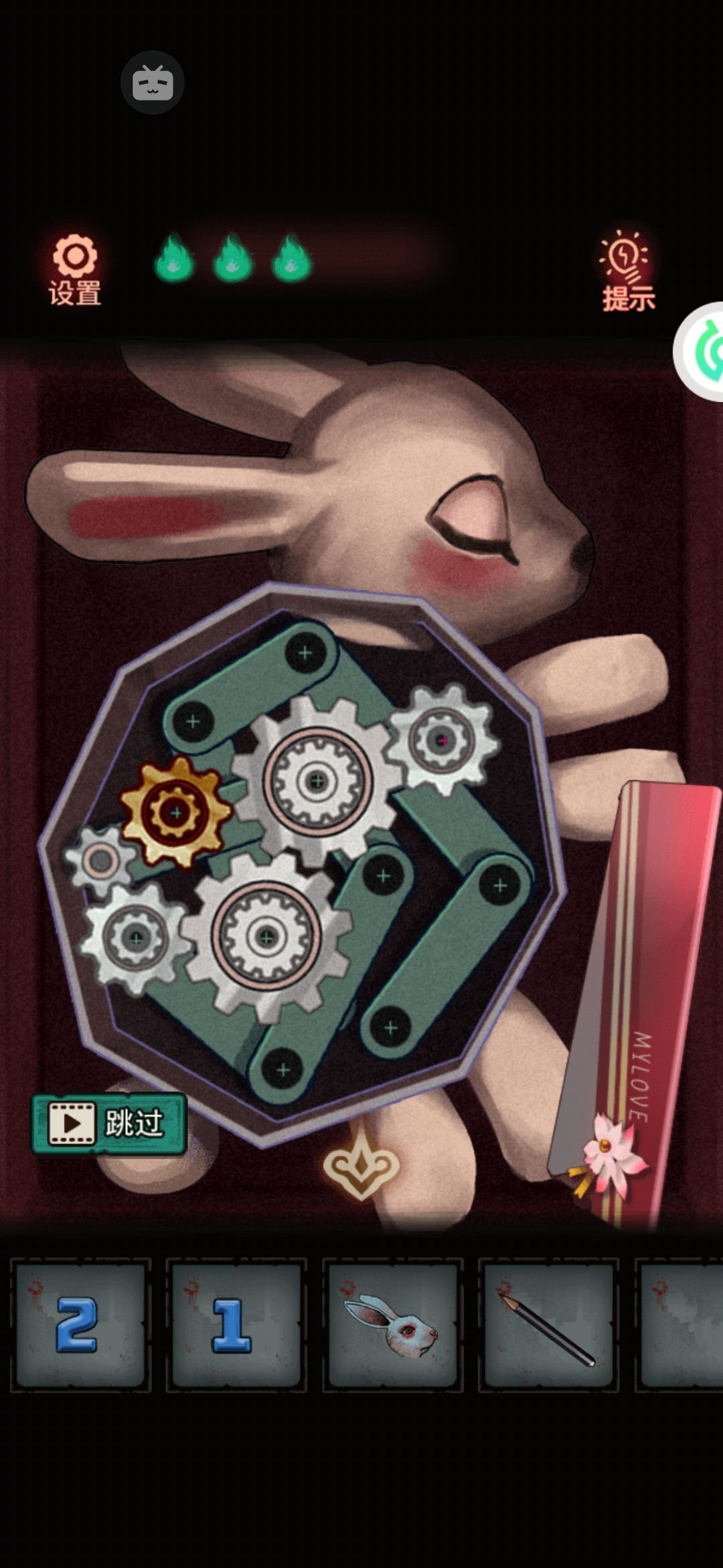 13。已经拿到礼品盒缺失的两个齿轮⚙️了,回到中间小店把齿轮先安在礼品盒上面,然后拖动每一个齿轮形成传动。然后这个兔头也掉了QAQ,底下还有把钥匙🔑。