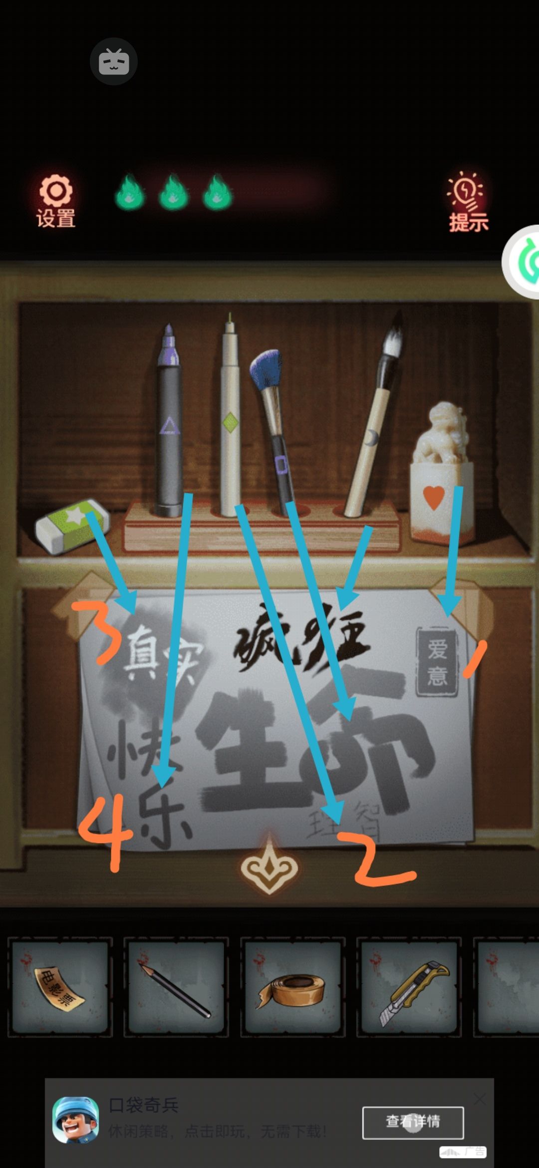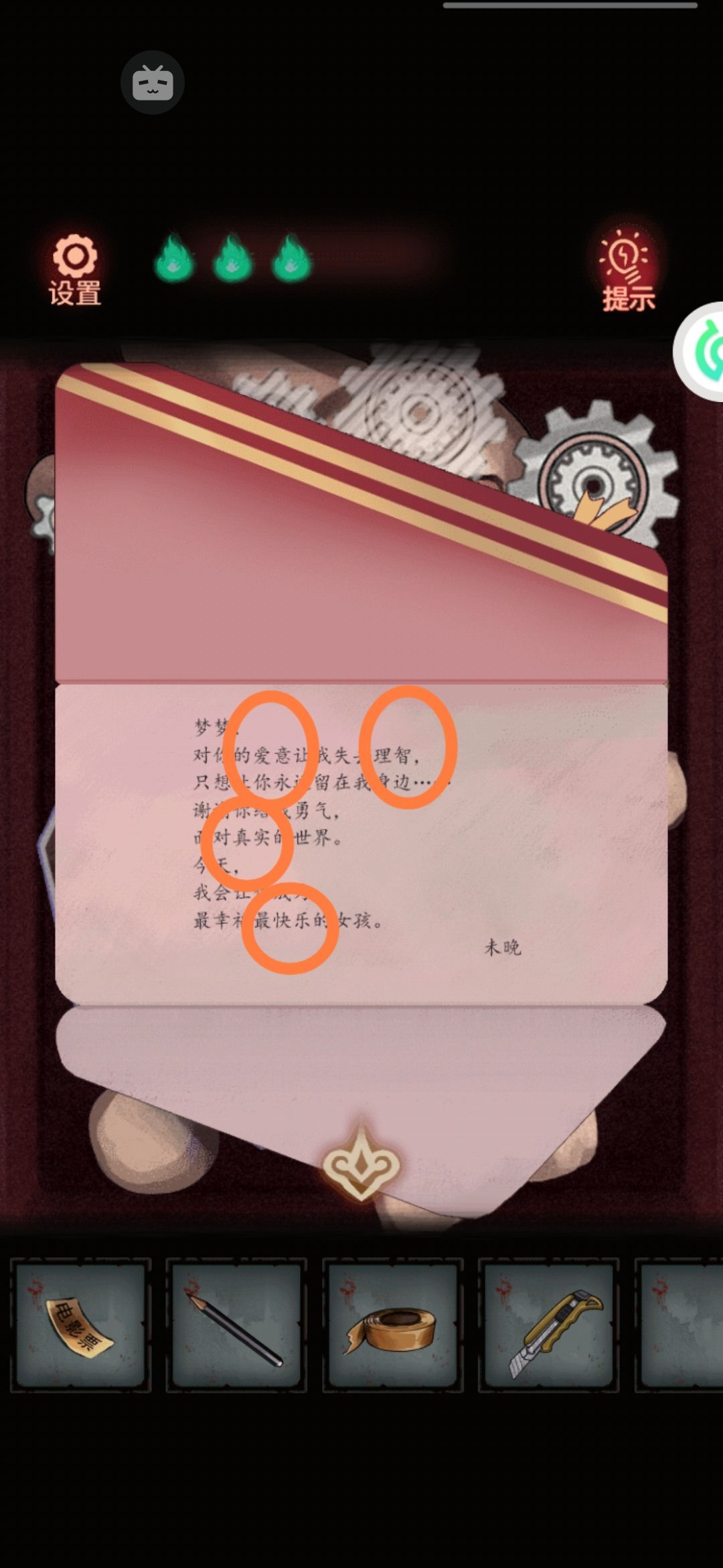 3。右边礼盒里有齿轮组和一封情书💌。啊他好会啊(灬ꈍ εꈍ灬)情书上有几个关键词:爱意,理智,真实,快乐。正好柜子中间贴着的那张纸上也有这几个词。一看就知道这几个词是上面的六种文具写出来的。最粗的生命是刷子,最细的理智是自动笔,带墨水的疯狂是毛笔,方的爱意是印章,白的真实是橡皮擦的,最后是马克笔的快乐。