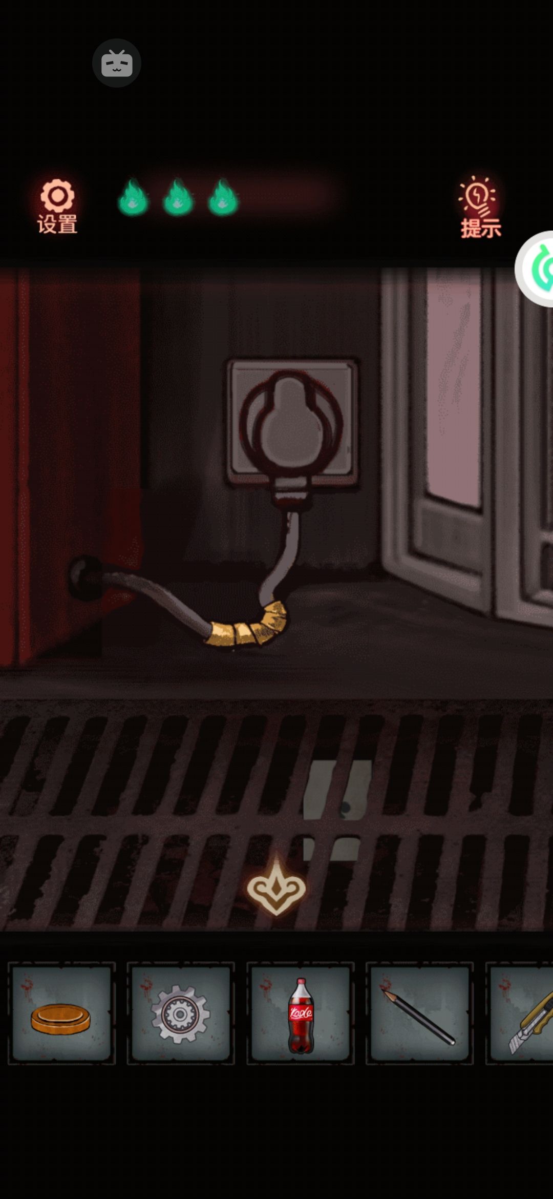 12。出来回到抓娃娃机的电源线那,用在门口捡的镊子在下水道夹个卡片出来,诶原来是张♣️梅花。