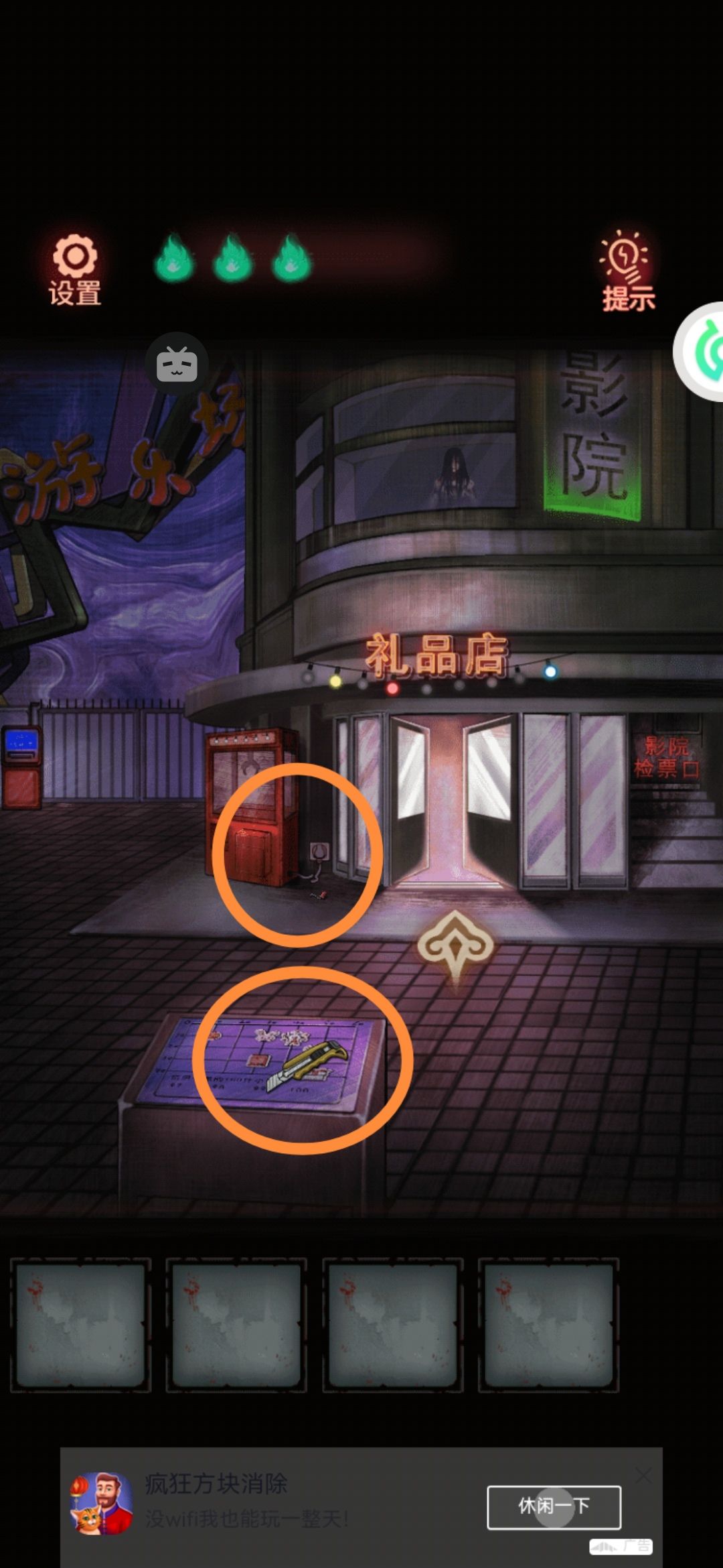 1。前面的指示桌上拿到一把美工刀。左边抓娃娃机脚下捡一个把手。