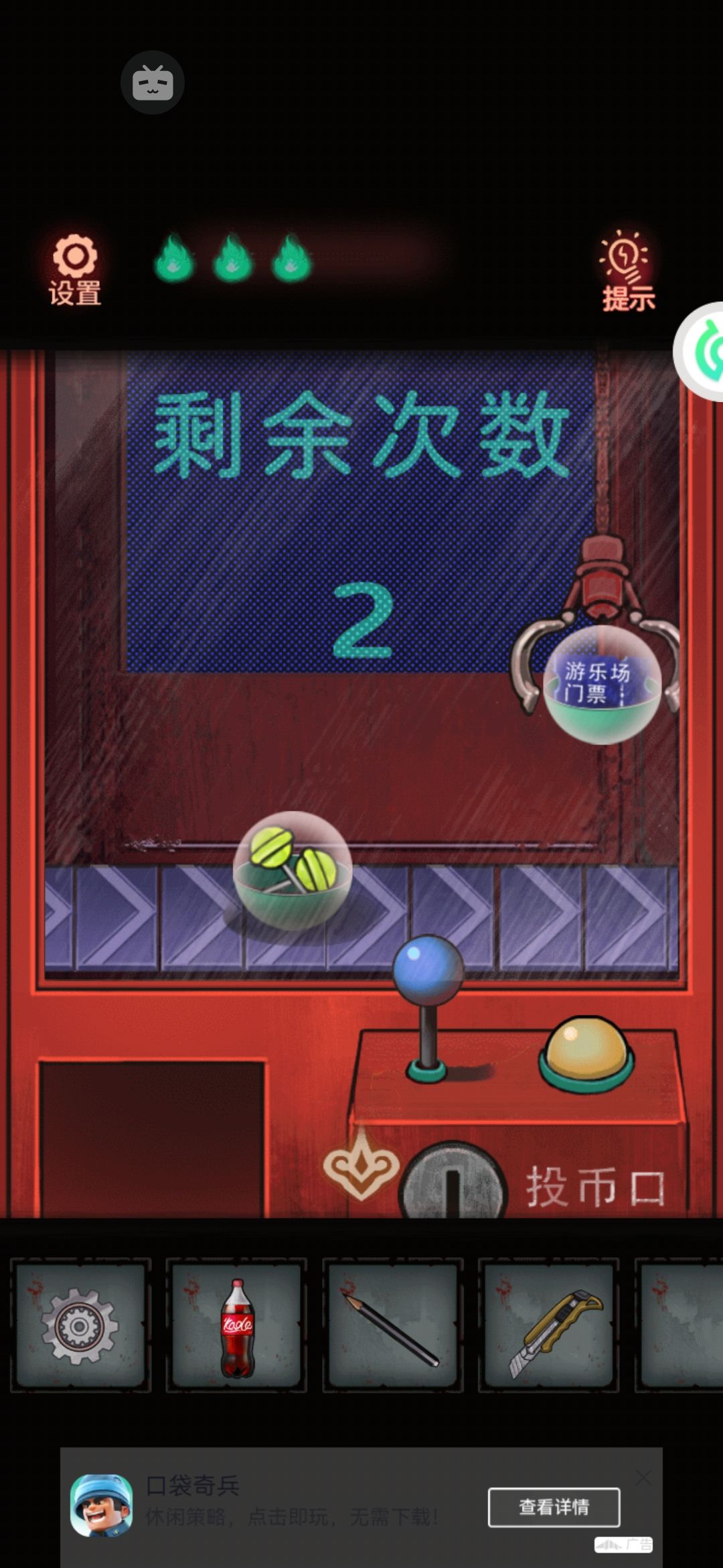 6。出门来抓娃娃机脚下,用胶带把电线接起来。然后就可以投币抓游乐园的票了~腰杆左右控制下抓。给最左边的游乐园检票完就可以进啦!