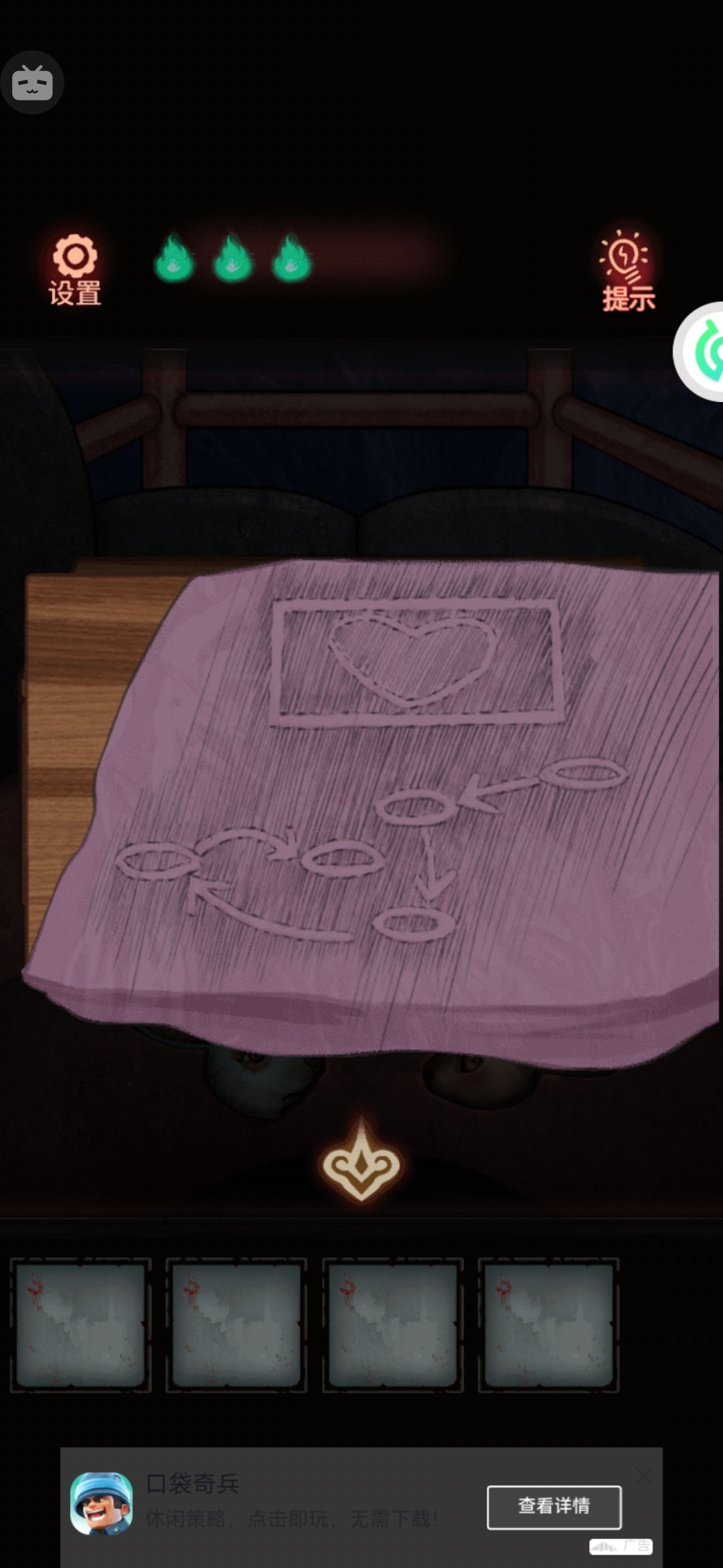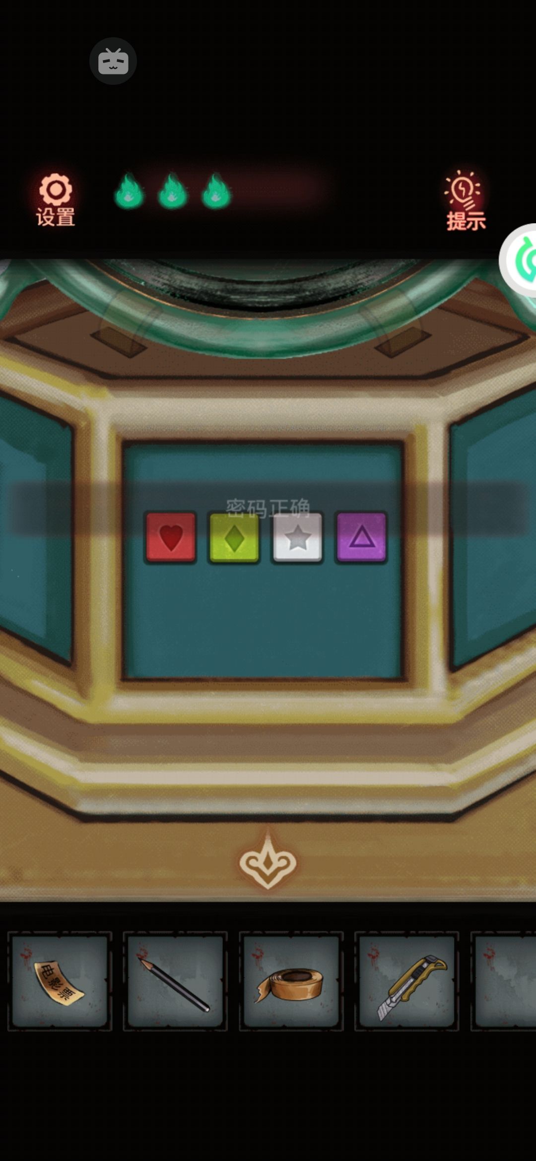 对应上面文具上的图案,按顺序应该是:❤️,◇,⭐,△。前面的绿色圆八音盒底座上的密码解开。这就可以把上面的透镜薅下来了。