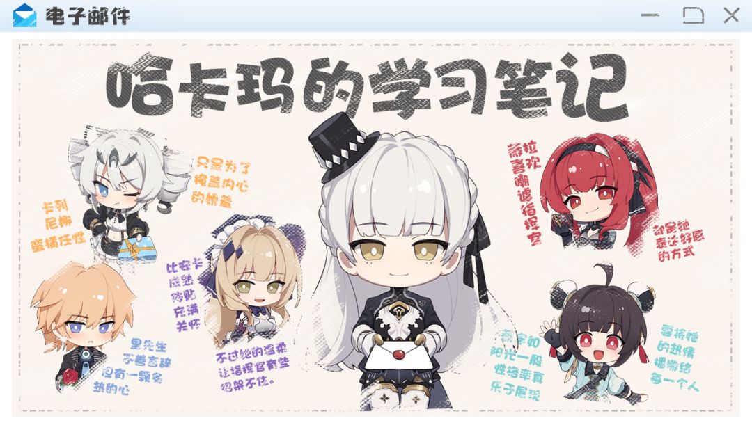 您有新的邮件通过观察指挥官和其他构造体的相处过程,哈卡玛已经整理出一份完整的学习笔记想请指挥官过目。