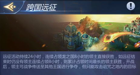 远征活动持续24小时,连续占领龙之国8小时的领主直接获胜,如远征结束时仍没有领主连续占领8小时,则累计占领时间最长的领主获胜,开战后,领主可战争传送至其他王国进行争夺,但只能攻击诅咒之地内的目标。