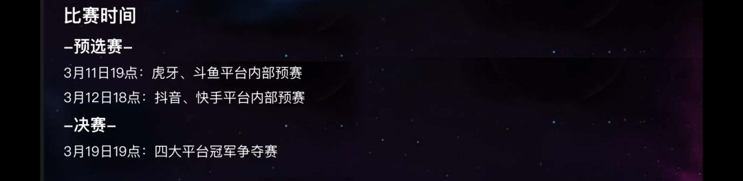 首先各大平台内主播队伍需要在平台内部打预选赛,获胜队伍可以代表该队伍所在平台进入决赛