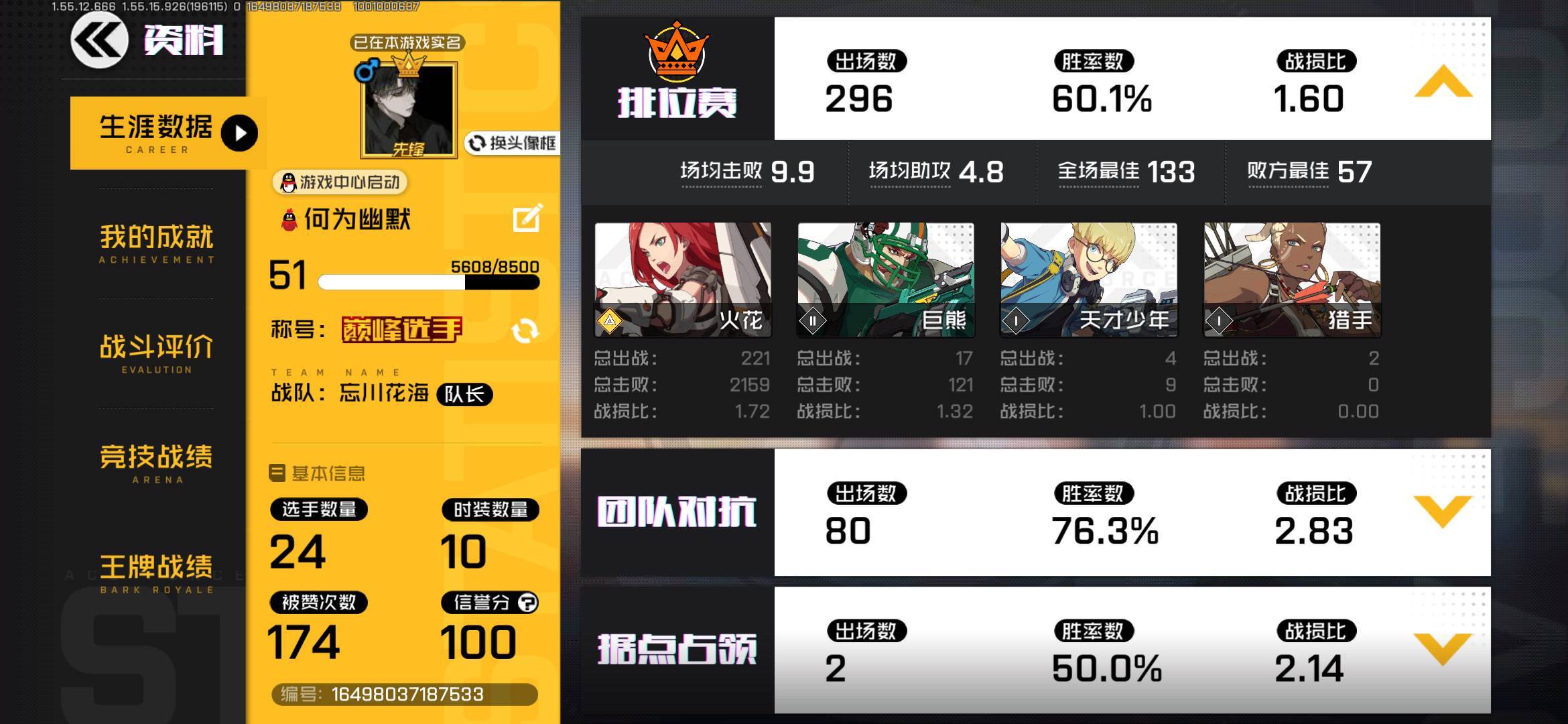 很久没玩这个游戏了,我应该是最早一批的火花顶尖玩家(可能是先锋赛季高端局没什么火花,kd和胜率我也附上了)真的挺怀念那段时间的,有机会再回坑吧😂