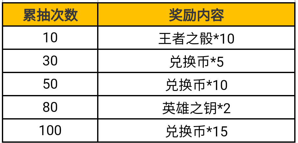 最后,黑武士诸神黄昏夺宝也设有累抽奖励,抽奖次数对应的奖励内容如下图所示。需要注意的是,每项奖励限领1次哦!