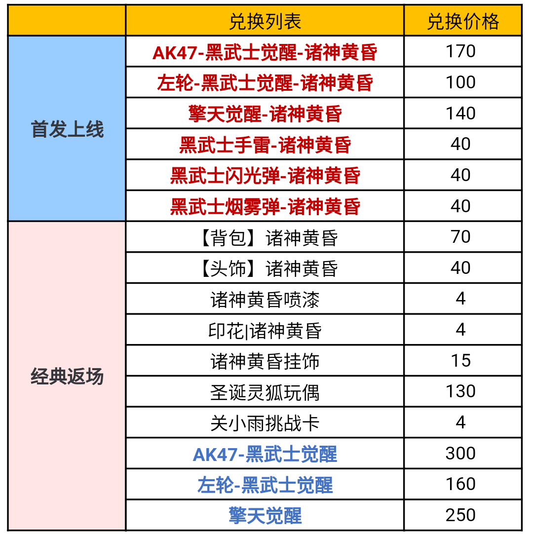 兑换币可用于兑换心仪的道具,除了上面提到过的道具之外,觉醒后的黑武士三件套、圣诞灵狐玩偶、关小雨挑战卡也可以在这里兑换。下图为常规道具的兑换价格,还有一些神秘的返场道具我们将会在下期为你爆料。