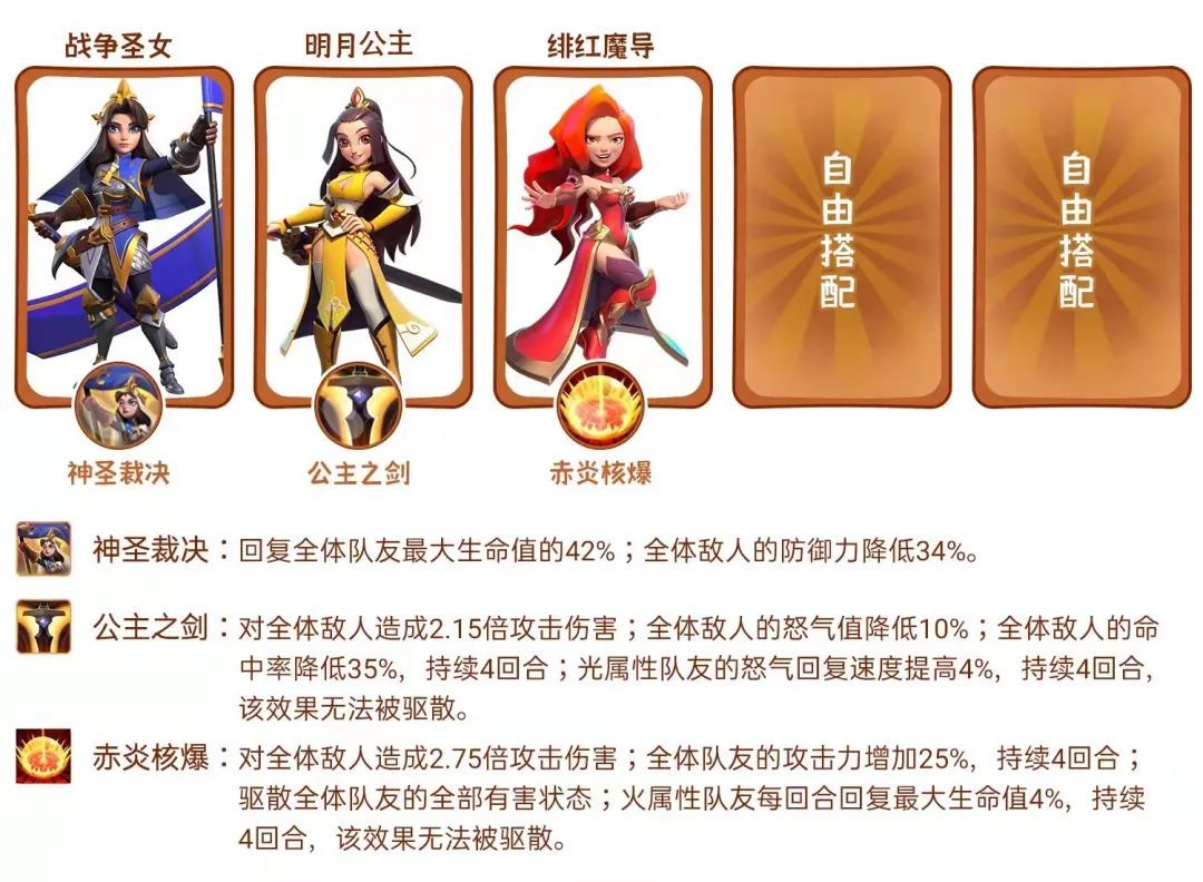 神圣裁决满级能够恢复全体队友42%生命,降低全体敌人34%防御,攻守兼备,在奶妈必备的阵容中,战争圣女更适合与全体输出型的英雄搭配,例如绯红魔导、明珠公主等,可以把降防收益最大化,打出爆炸AOE效果。