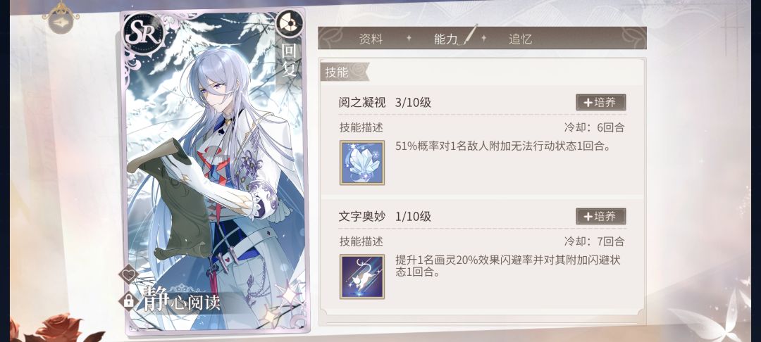 2.静心阅读同上,一技能冷冻敌方主力“司岚冕下”,二技能给奶卡保命。