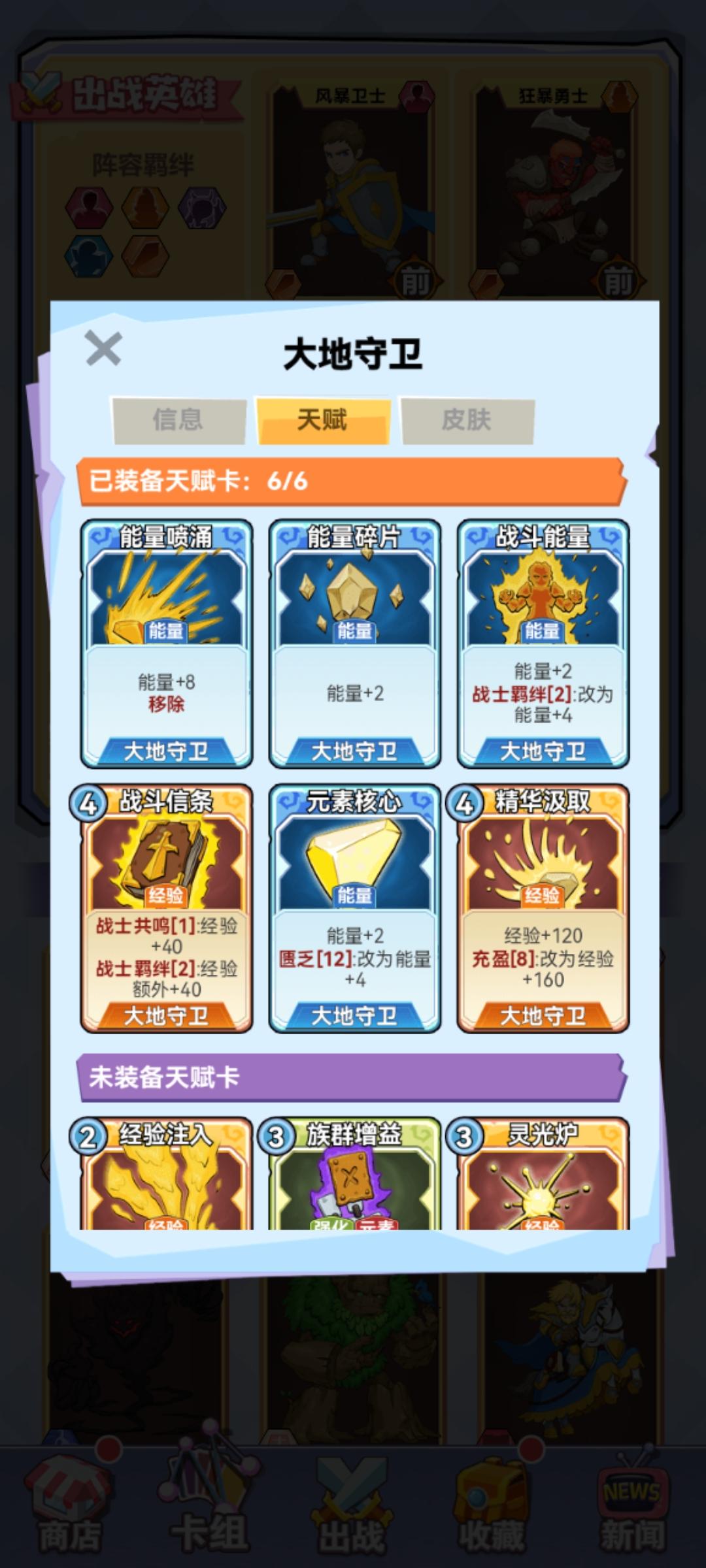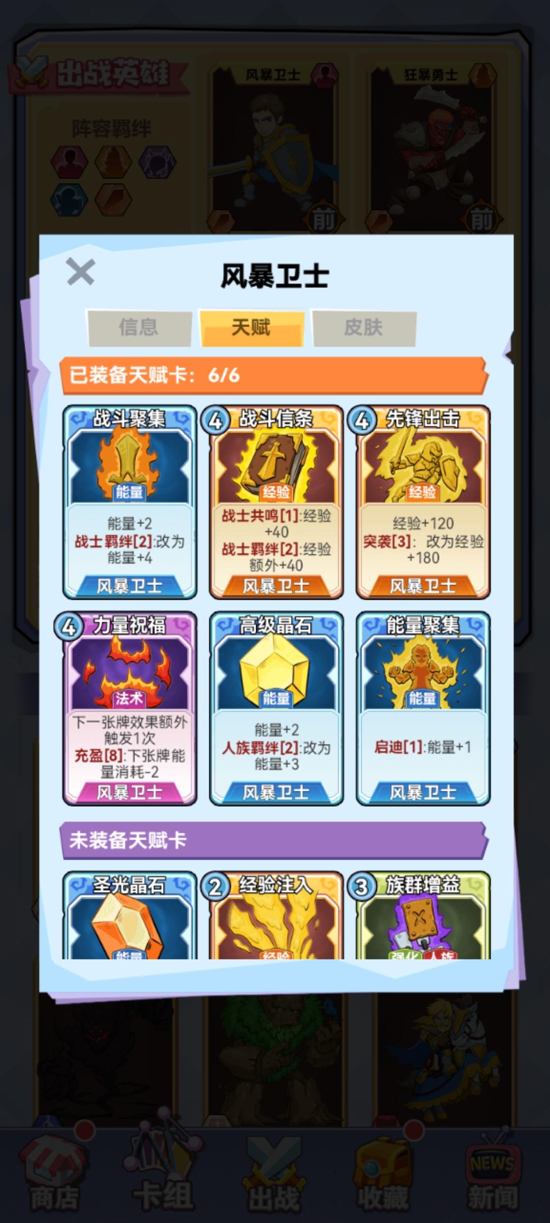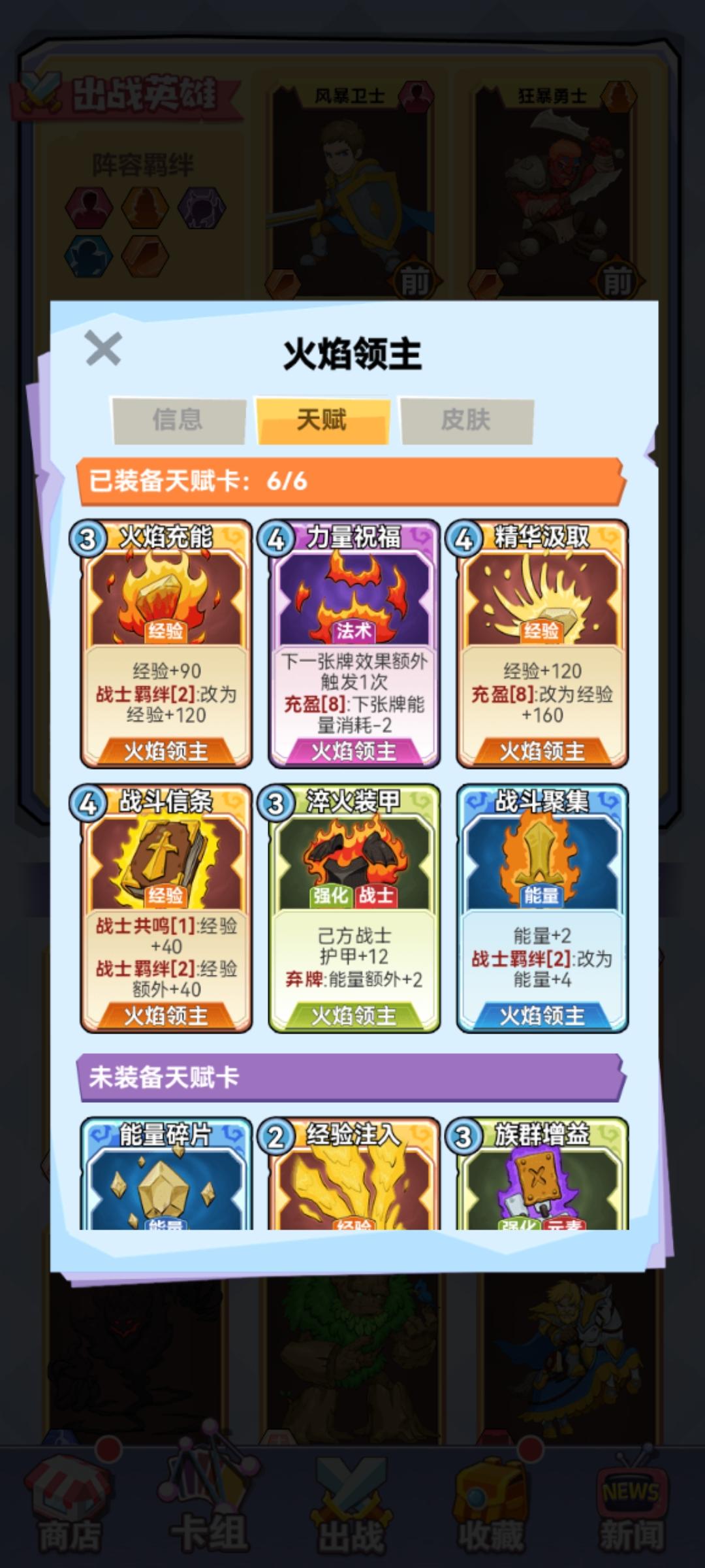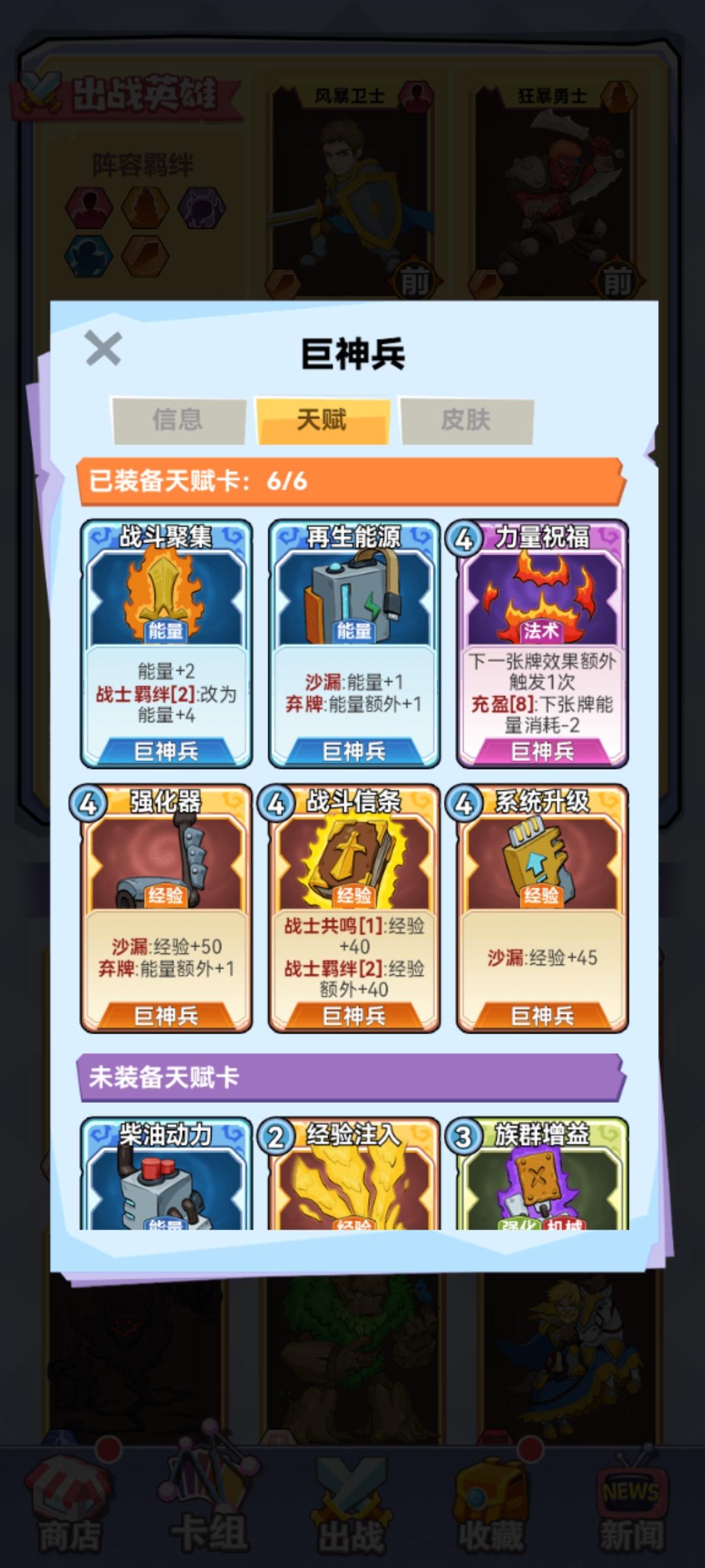 站位和卡组见附图。1、强化卡:带两张强化。蛮战的“族群增益”,加战士30%攻速,配合增加机器战士的大招释放概率,蛮战的砍人效率,还有火元素的加快大招时间,丢弃还能得一费能量,保证用不用都能有收益;火元素的“火装甲”,增加护甲12点,配合羁绊的减伤,面对物理刺客输出,简直没有压力,同样丢弃增加两费能量,用不用都能有收益。2、升级思路,简单的就是来啥经验卡升级啥,但是有个弊端就是面对对方高质量卡牌时,很容易因为升级思路错误,导致伤害打不出或者不能升级到五稳定胜局。最后附的两个图可以清楚看到,大家都是五战士,我因为发牌员被卡了等级,但是我合理的升级了输出核心,火元素和蛮战,对面升级风暴战士,我能连续两个回合越10个多级干掉对面,说明升级战士核心输出的重要性,因为战士太缺伤害了,升级不好,后期缺伤害问题爆出问题越明显,也是我第一次17连胜断了的原因。升级进阶思路,依旧前期来啥用啥,中期双倍技能卡有了就搭配蛮战,火元素经验卡使用,如果只有单张经验卡使用无法升一级的情况下,丢到抽排堆,配合双倍牌使用。这样就能保证双核心稳定升四级,更快升五级,这就是升级优先度。3、双倍卡,卡组携带三张,优先搭配蛮战和火元素经验卡使用,获得最大伤害收益。记住自己使用强化的次数,不记得看抽牌堆,单张经验卡无法升四级五级时,配合双倍,让输出核心完成升级,伤害质变下,打出对对面的致命一击。