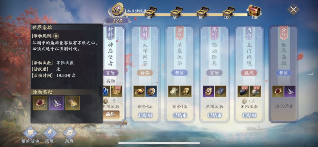 【世界枭雄】在每周三、周六、周日的19:50-20:10开放。江湖纷乱,各地枭雄举起反旗,玩家们需尽快前往将其击败。玩家们需要以帮派为单位,传送至世界BOSS所在场景,击败幻象和本体均可获得丰厚奖励,且根据帮派的整体伤害,排名的不同也将决定BOSS的掉落归属权。奖励:黄龙丹、功法残页。
