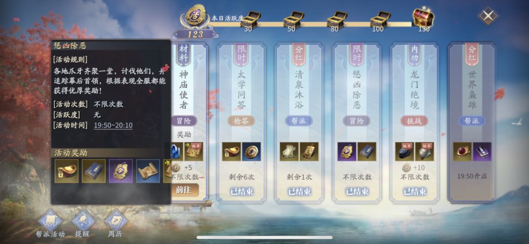 【惩凶除恶】每周二、周五的19:50-20:10开放。各地匪寇、盗贼活动频繁,侠士们将其讨伐,抓住罪魁祸首,赏重金。活动分为两个阶段,第一阶段玩家需要击败精英怪,二阶段则是组队讨伐BOSS,最终根据表现,全服发放优厚奖励。奖励:惩恶珍稀宝箱、监察院密令、藏宝图、乙坊令、见识、绑定元宝。