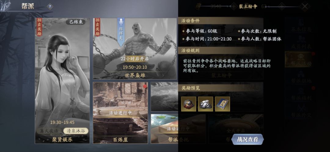 【裂土纷争】在每周日的21:30-21:30开放。成大事者,必有自己的一席之地。玩家需帮助所在帮派进行领地争夺,共计四个领地,击杀怪物/BOSS获得相应的帮派积分,最终积分位于榜首的帮派将获得这片领地的所有权。奖励:天脉奇玉、天外炙铁、伙伴技能书。