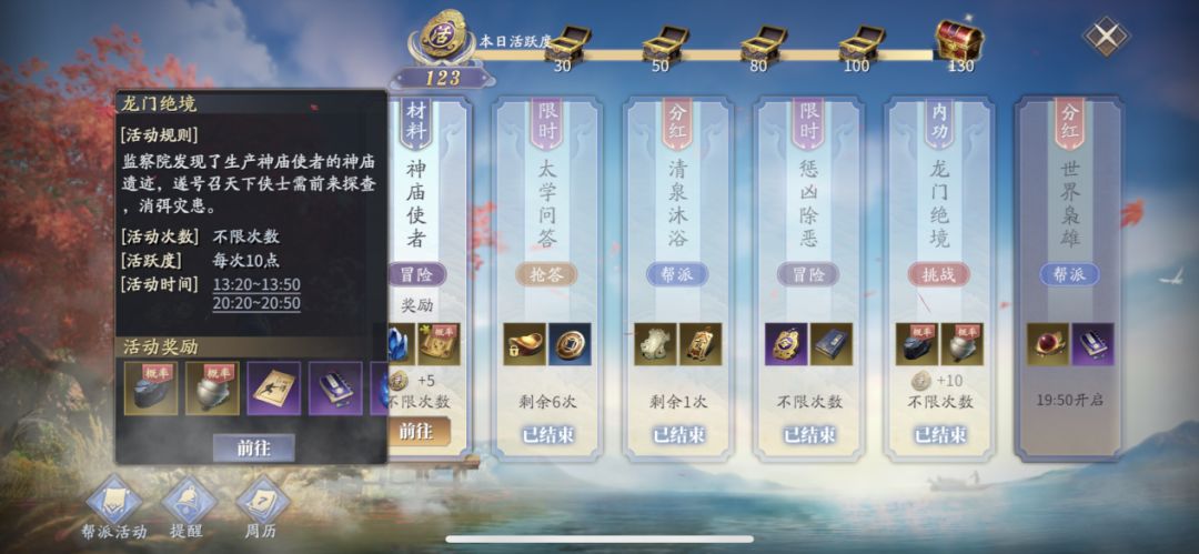 限时任务分别是:神庙争锋、问鼎江湖、东山问战、雪球乱斗、龙门绝境、惩凶除恶、世界枭雄、裂土纷争。每个限时任务开启时间不同,小编会在周历中指明具体。
